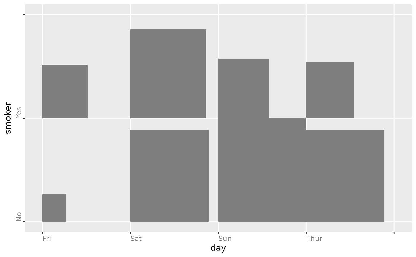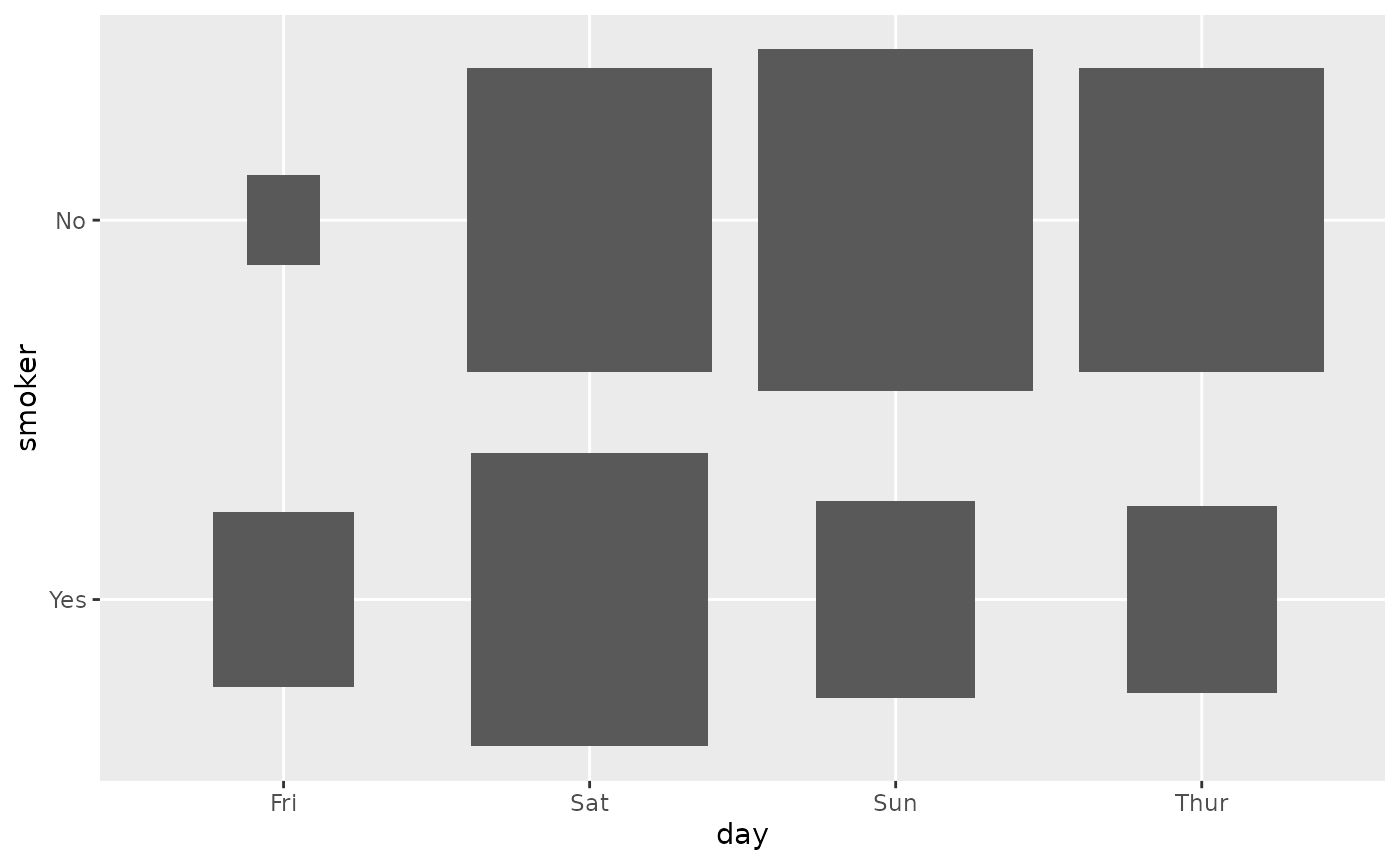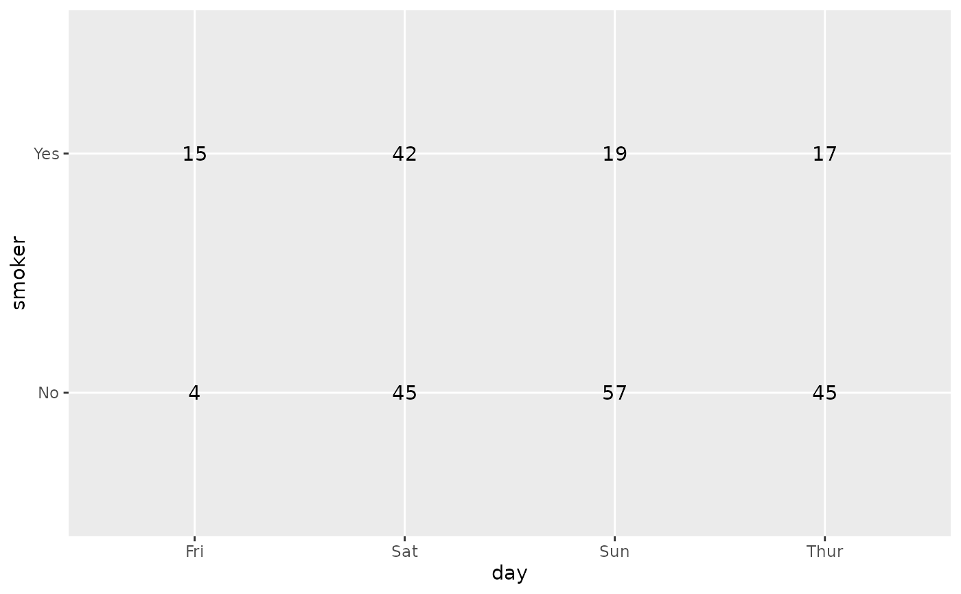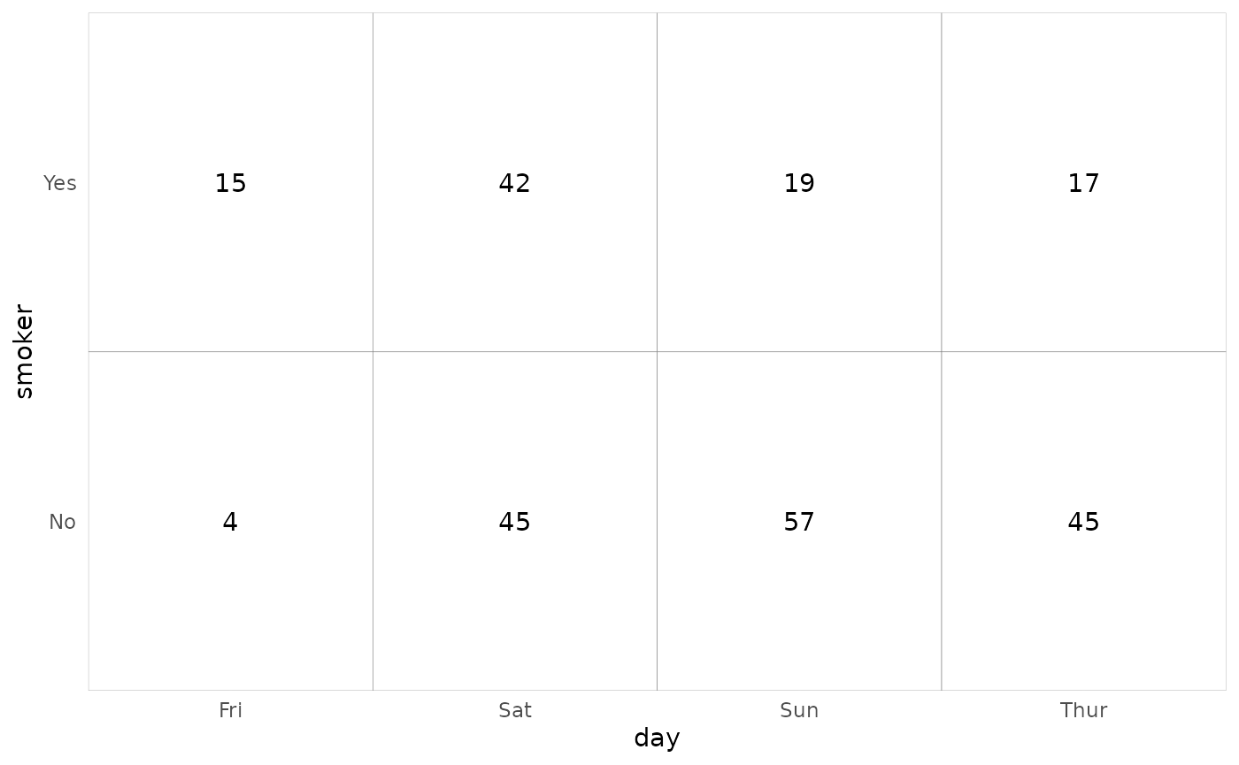 ggally_table(tips, aes(x = day, y = smoker))