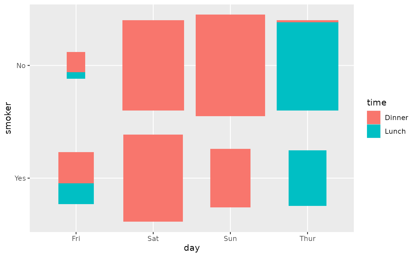 ggally_table(tips, aes(x = day, y = smoker, colour = time))
