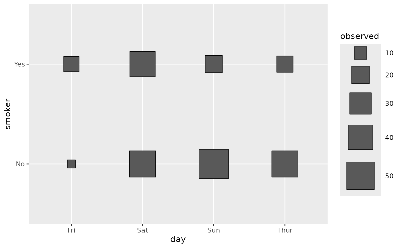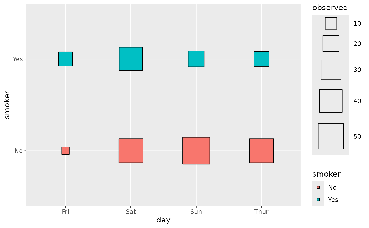 ggally_crosstable(tips, aes(x = day, y = smoker))