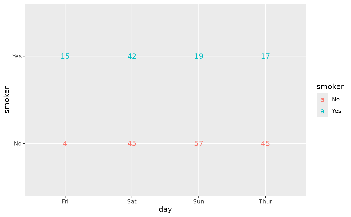 ggally_table(tips, aes(x = day, y = smoker, colour = smoker))