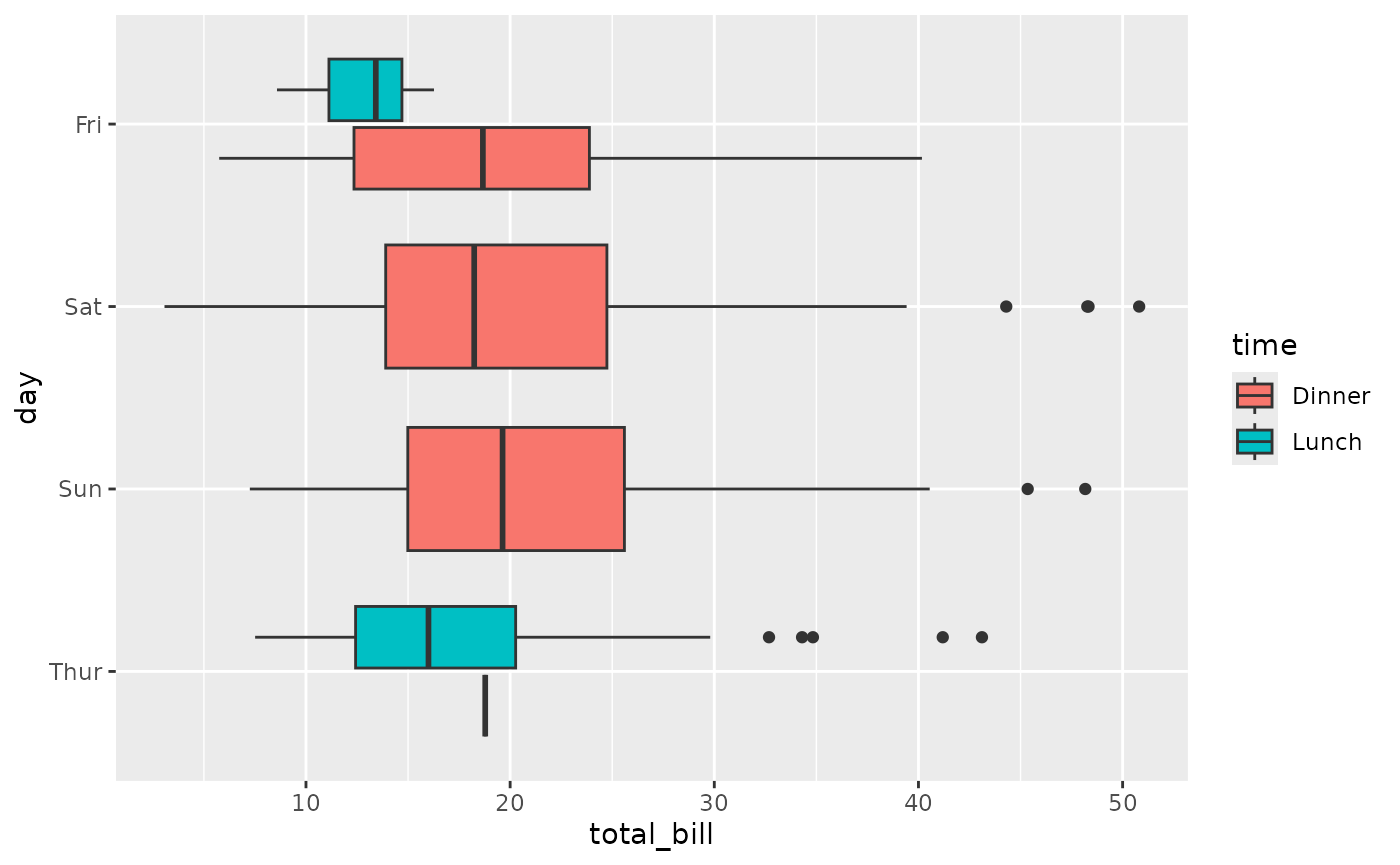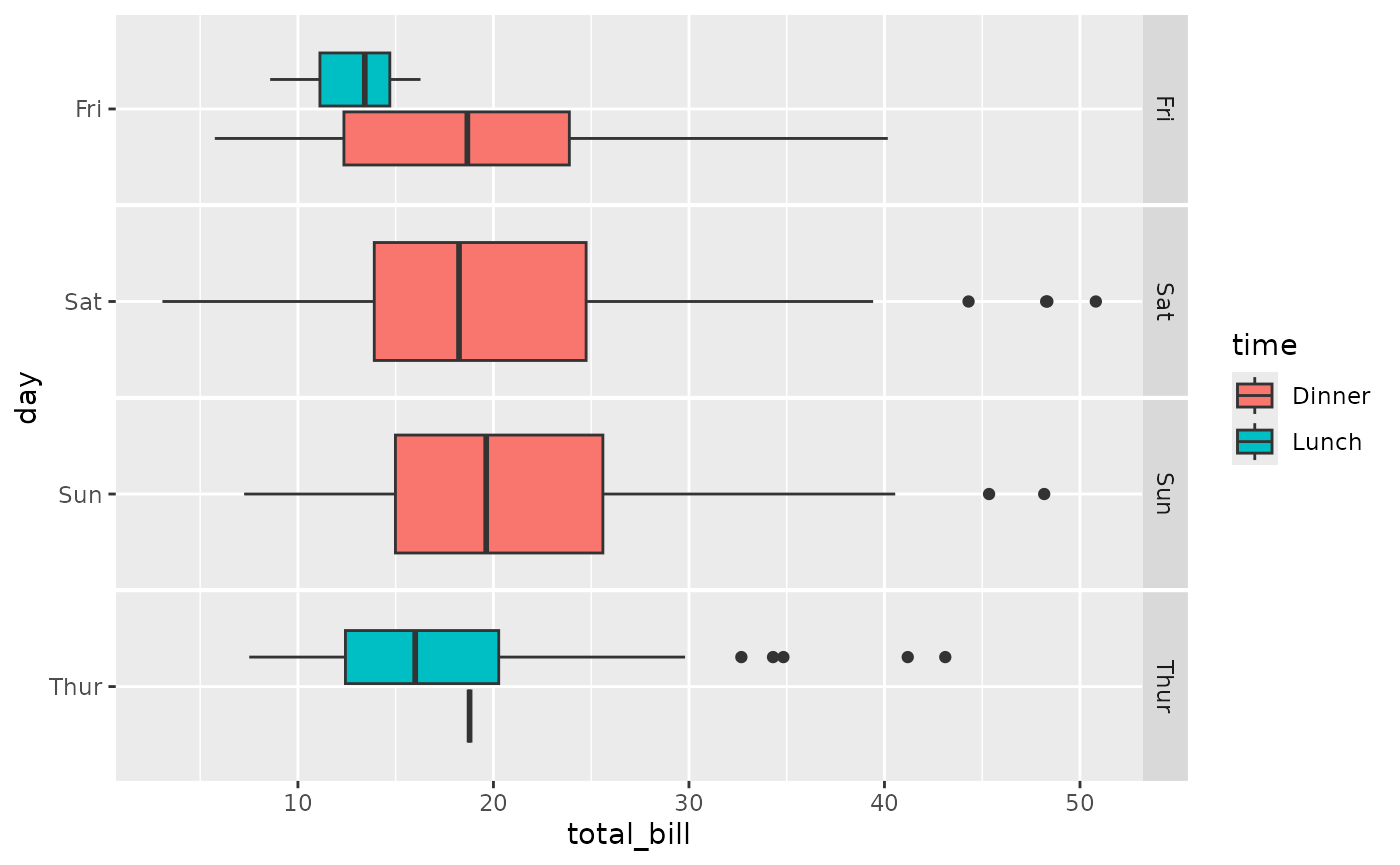 ggally_box_no_facet(tips, aes(x = total_bill, y = day, colour = time))