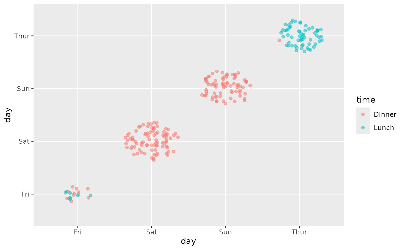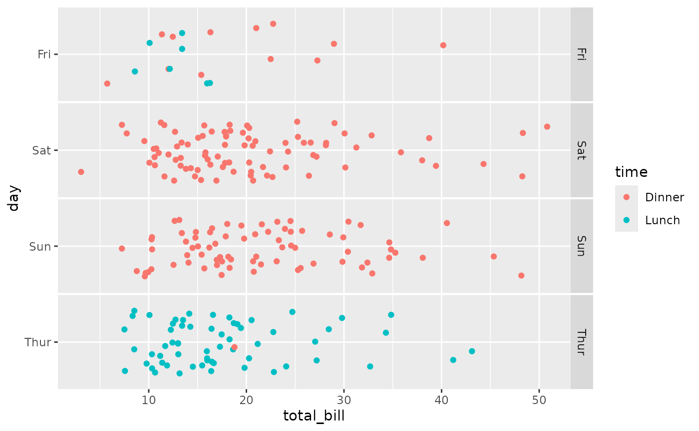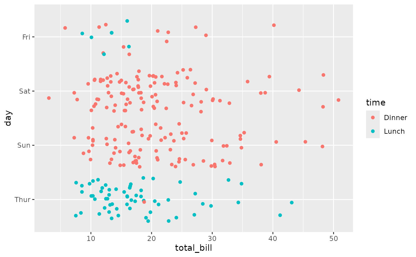 ggally_dot_no_facet(tips, aes(x = total_bill, y = day, colour = time))