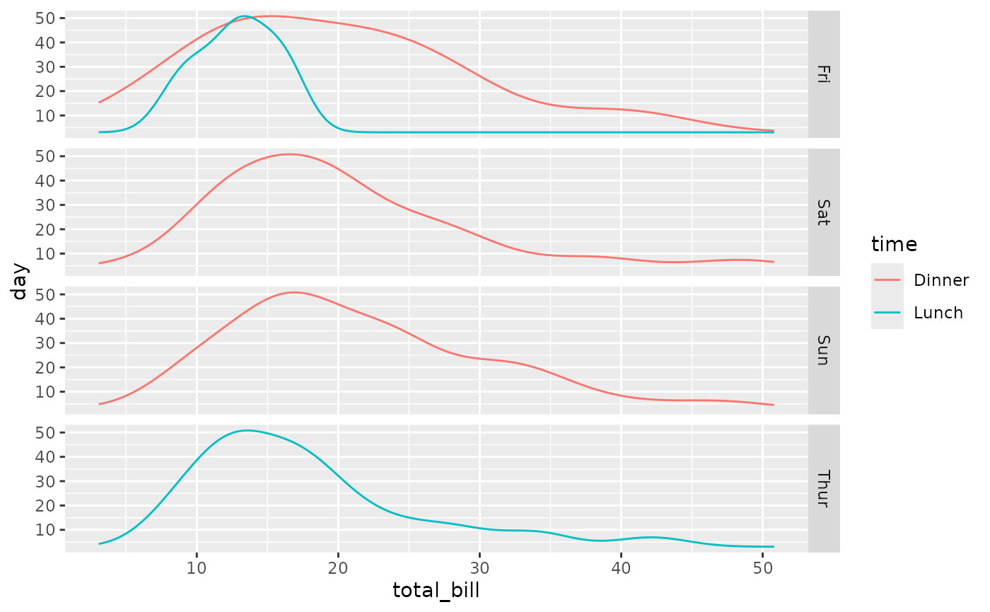ggally_denstrip(tips, aes(x = total_bill, y = day, colour = time))