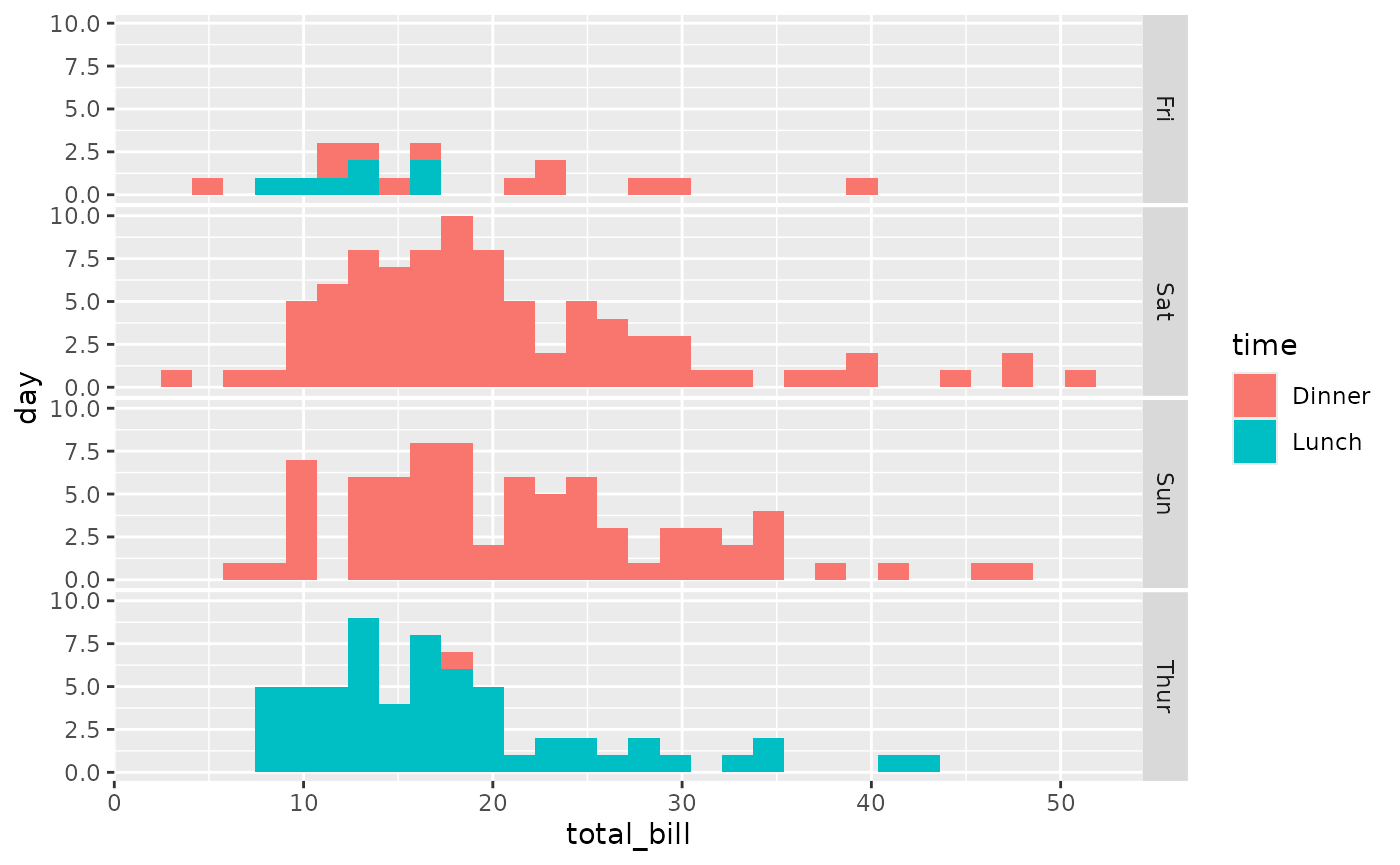 ggally_facethist(tips, aes(x = total_bill, y = day, colour = time))