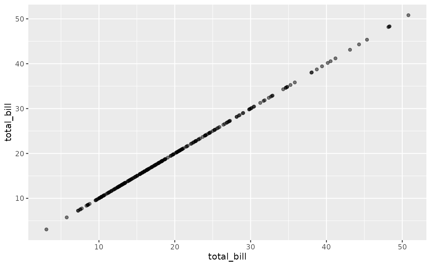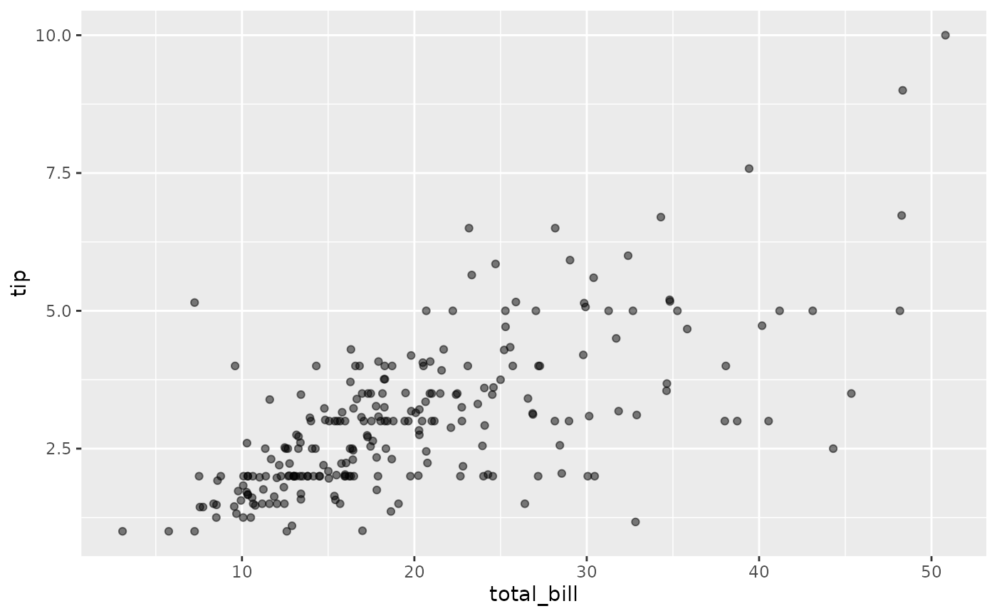 ggally_autopoint(tips, aes(x = total_bill, y = tip))