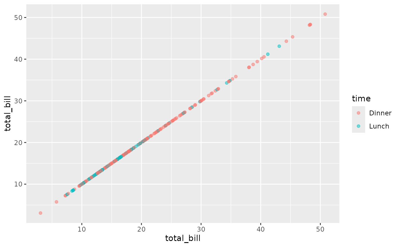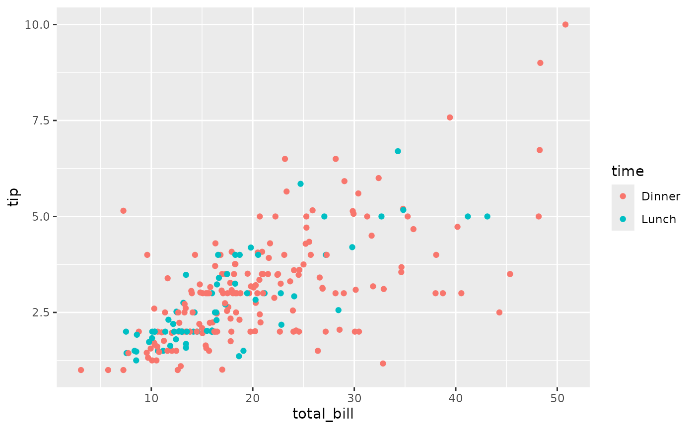 ggally_points(tips, aes(x = total_bill, y = tip, colour = time))