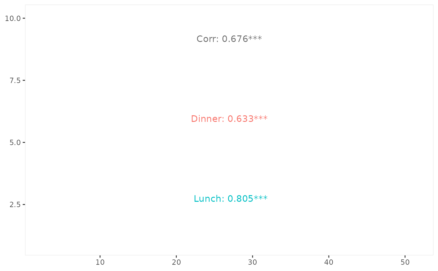 ggally_cor(tips, aes(x = total_bill, y = tip, colour = time))