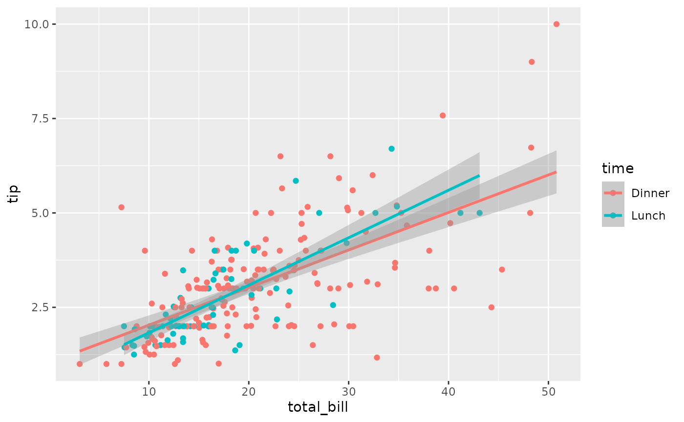 ggally_smooth_lm(tips, aes(x = total_bill, y = tip, colour = time))
