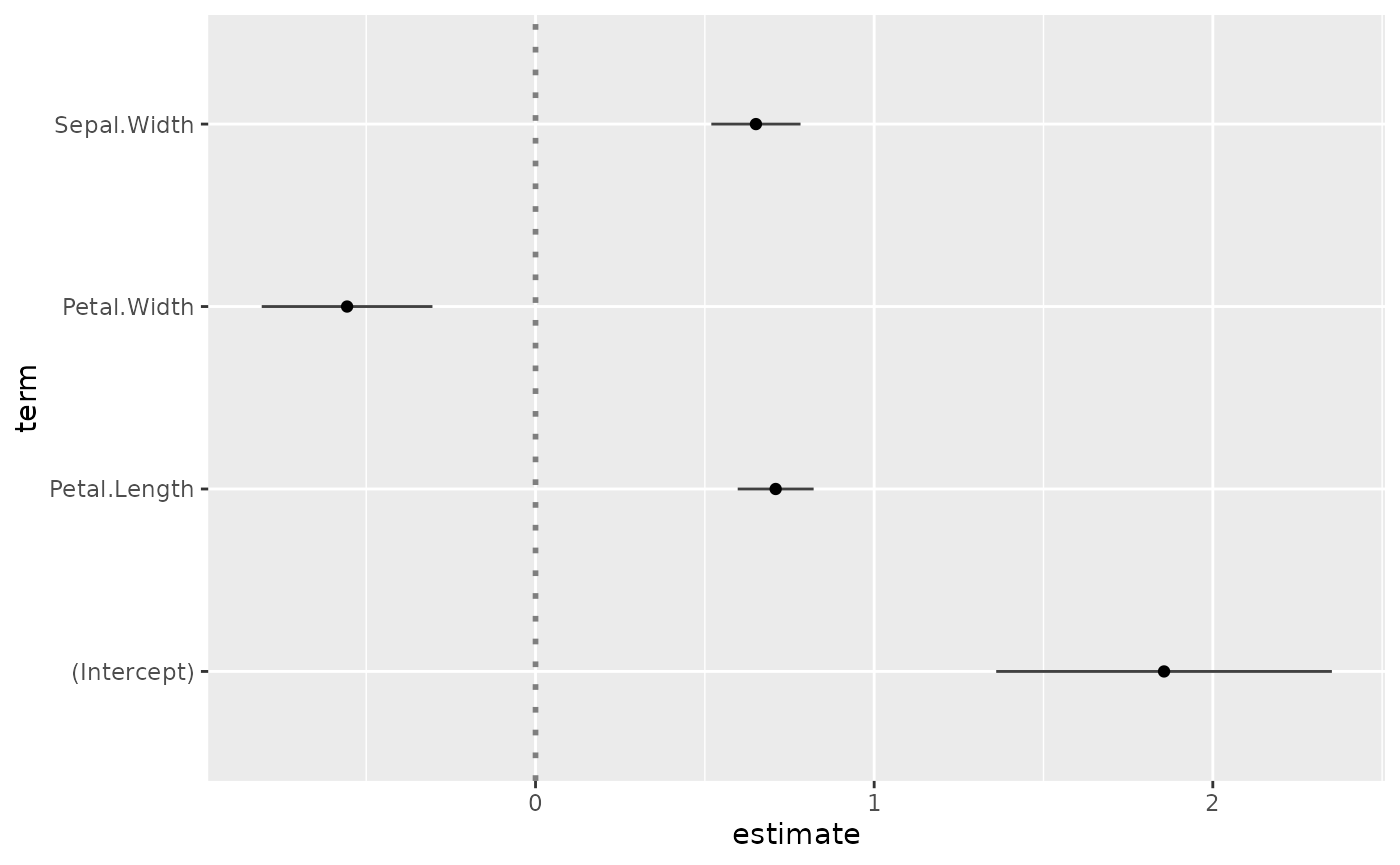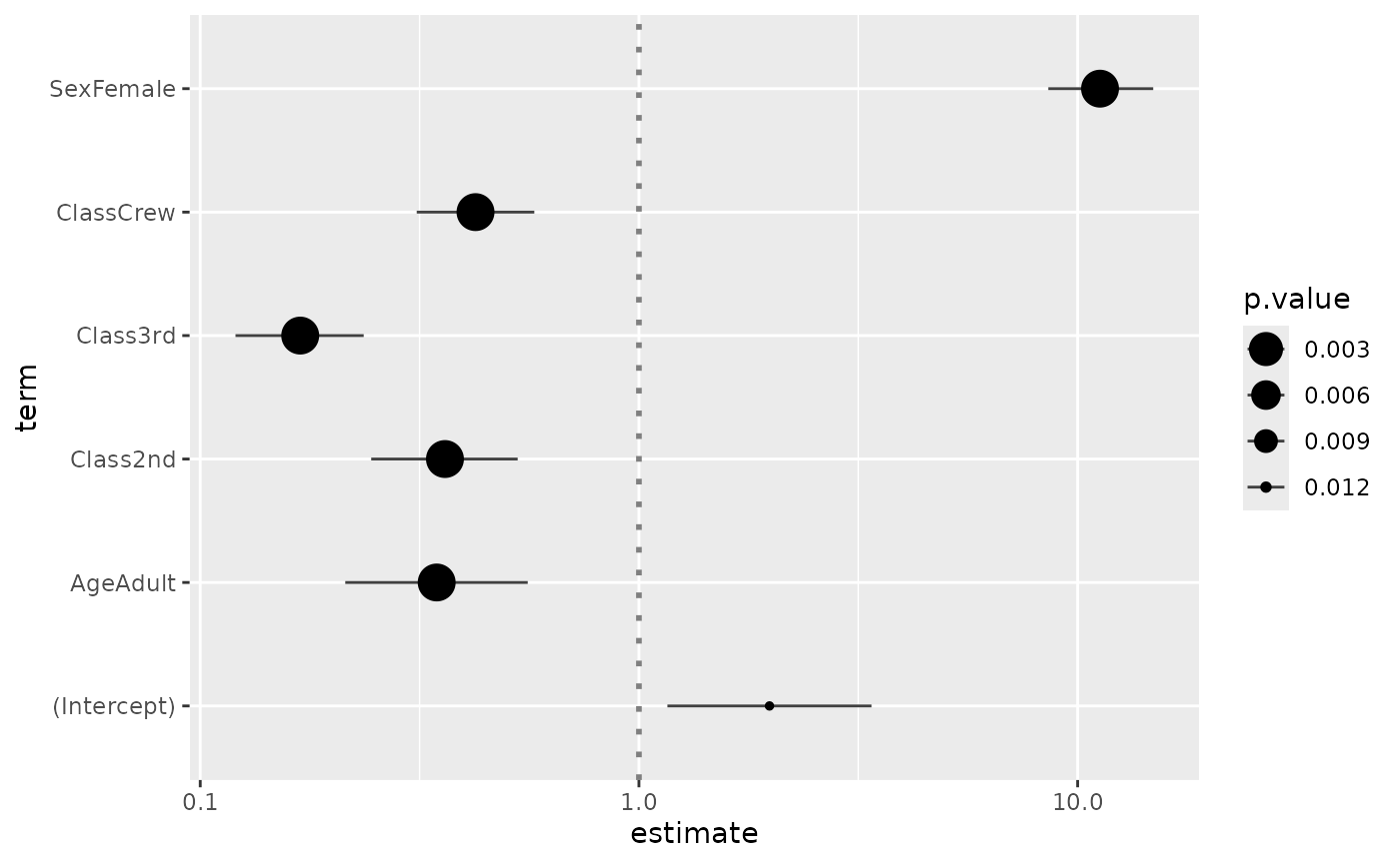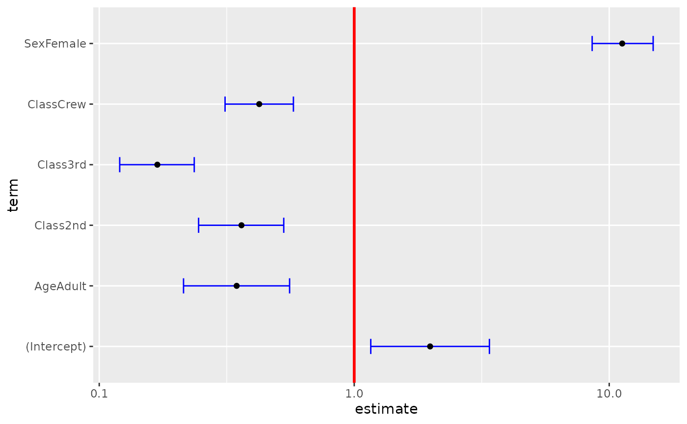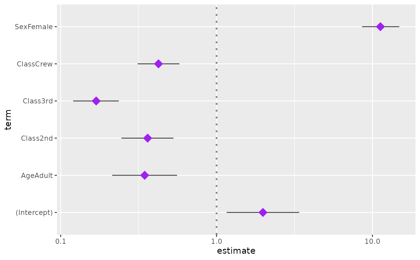 In the case of a logistic regression (or any other model for which coefficients are usually exponentiated), simply indicated exponentiate = TRUE. Note that a logarithmic scale will be used for the x-axis.