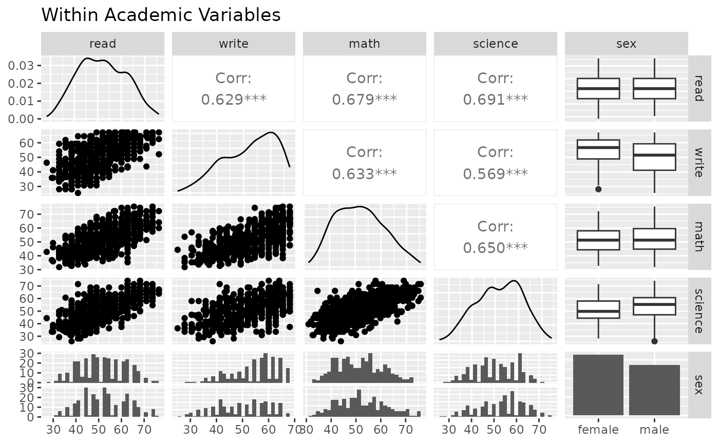 #> [1] "read" "write" "math" "science" "sex"First, look at the within correlation using ggpairs().