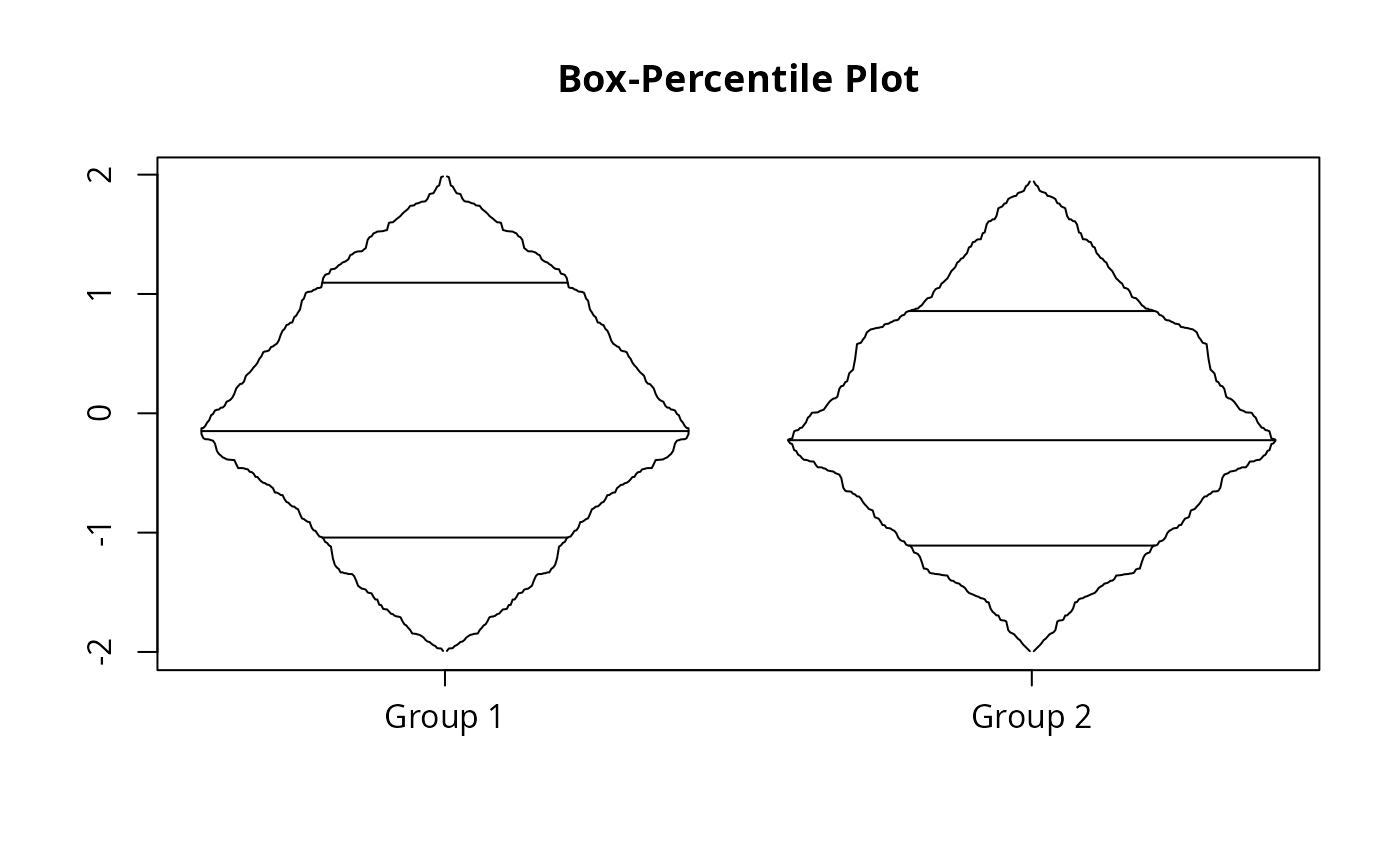 Box-percentile plots are similiar to boxplots, except box-percentile plots supply more information about the univariate distributions. At any height the width of the irregular "box" is proportional to the percentile of that height, up to the 50th percentile, and above the 50th percentile the width is proportional to 100 minus the percentile. Thus, the width at any given height is proportional to the percent of observations that are more extreme in that direction. As in boxplots, the median, 25th and 75th percentiles are marked with line segments across the box.