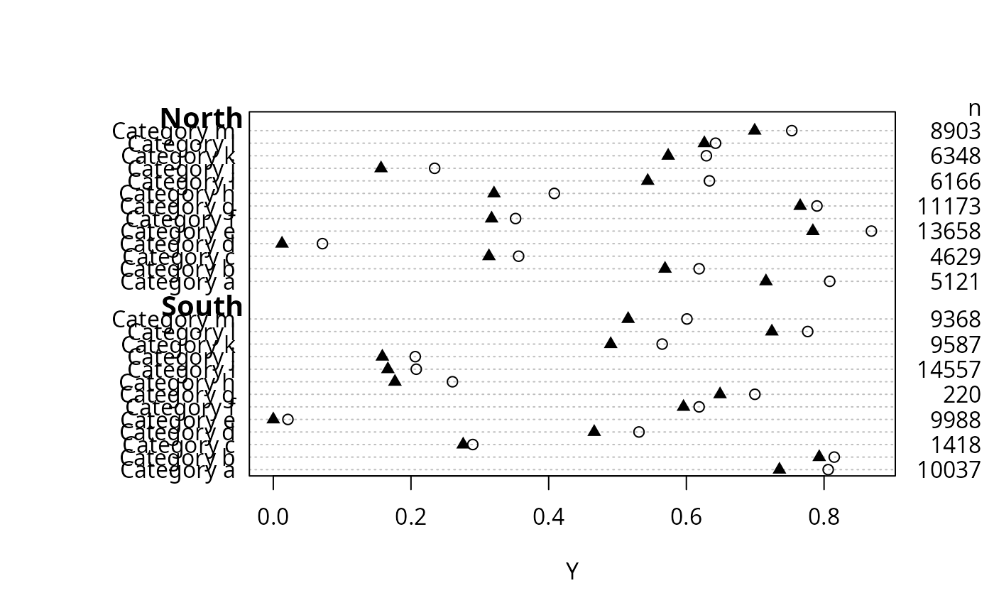 dotchart3(cbind(y1,y2), g, groups=maj, auxdata=n, auxtitle='n',