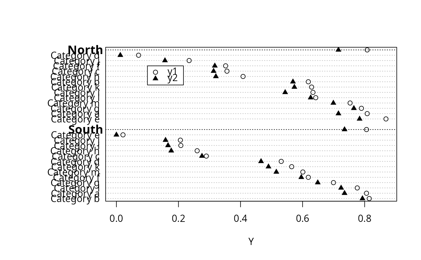 dotchartp(cbind(y1, y2), g, groups=maj, auxdata=n, auxtitle='n',