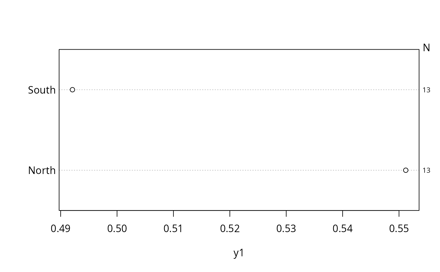 summaryD(y1 ~ maj, fun=function(y) c(Mean=mean(y), n=length(y)),
