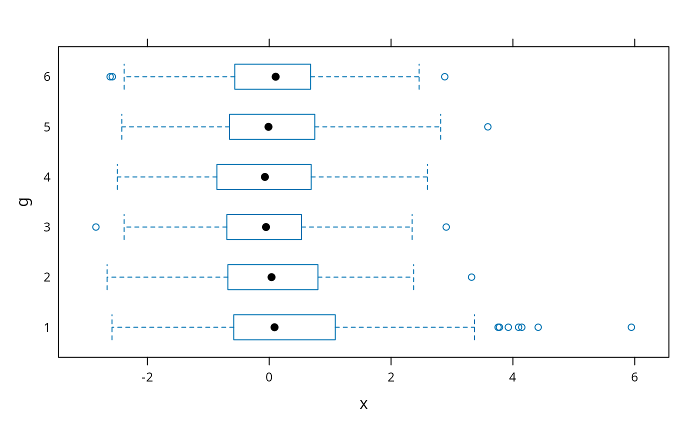 bwplot(g ~ x, panel=panel.bpplot, nout=5)