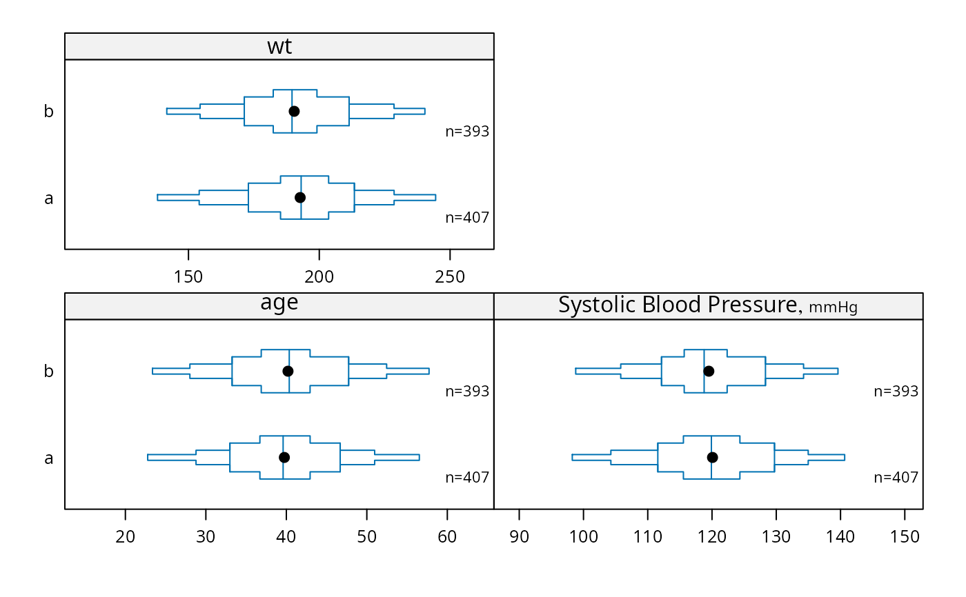 bpplotM(age + bp + wt ~ treatment, data=d, nloc='left')