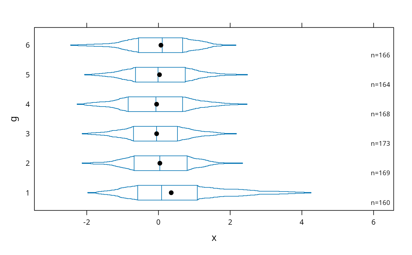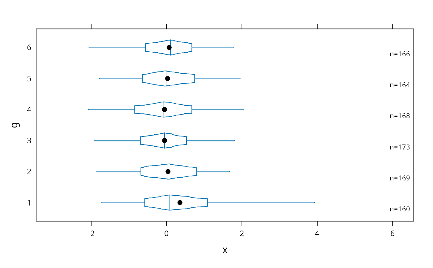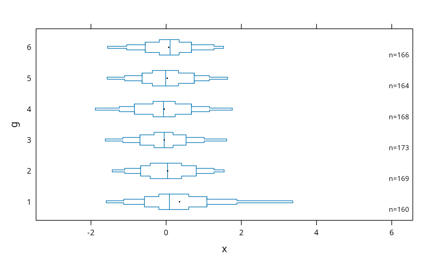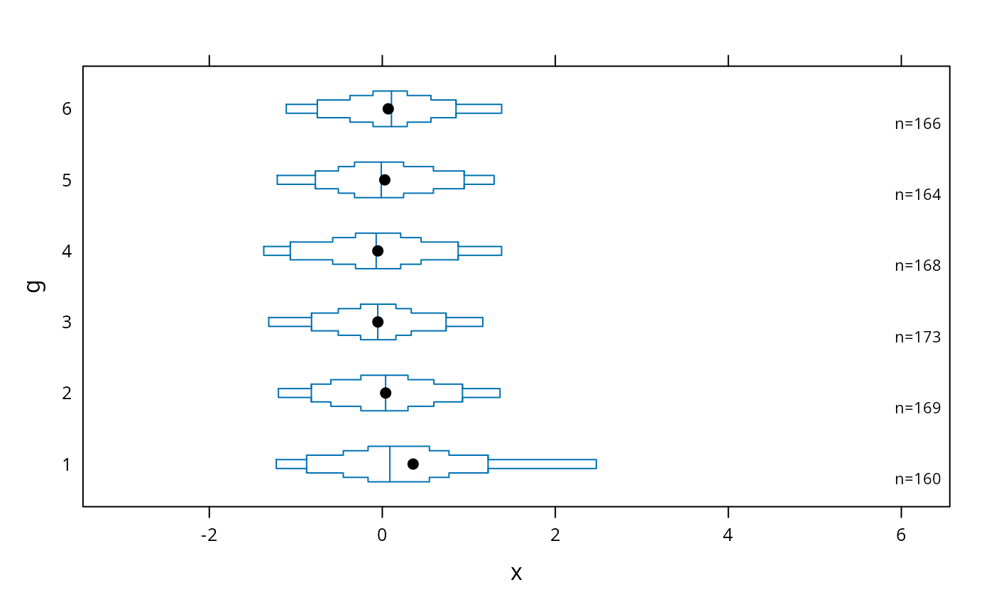 bwplot(g ~ x, panel=panel.bpplot, cex.means=.3)