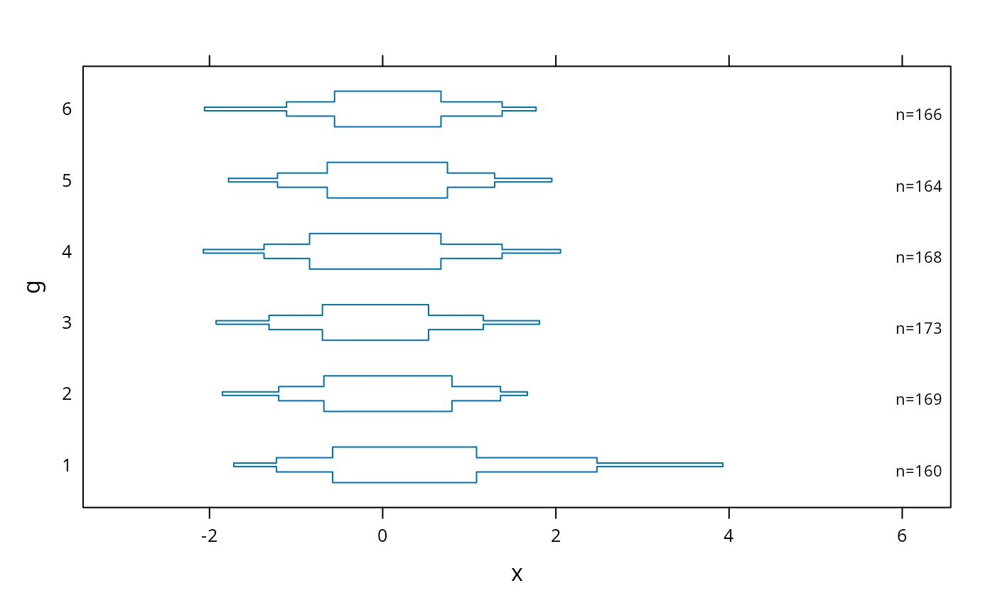 bwplot(g ~ x, panel=panel.bpplot, probs=seq(.01,.49,by=.01), datadensity=TRUE)