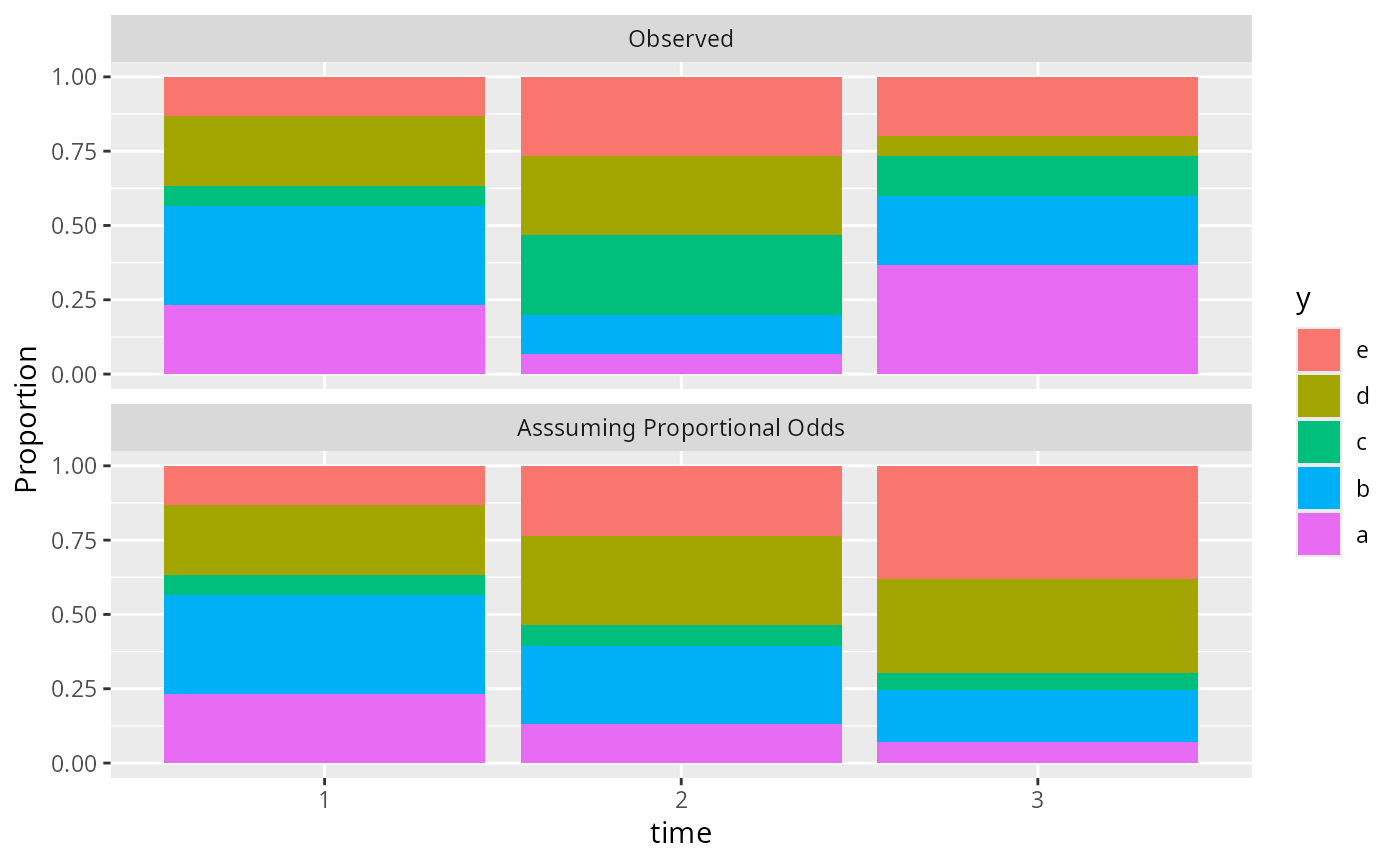 propsPO(y ~ time, data=d, odds.ratio=function(time) c(1, 2, 4)[time])