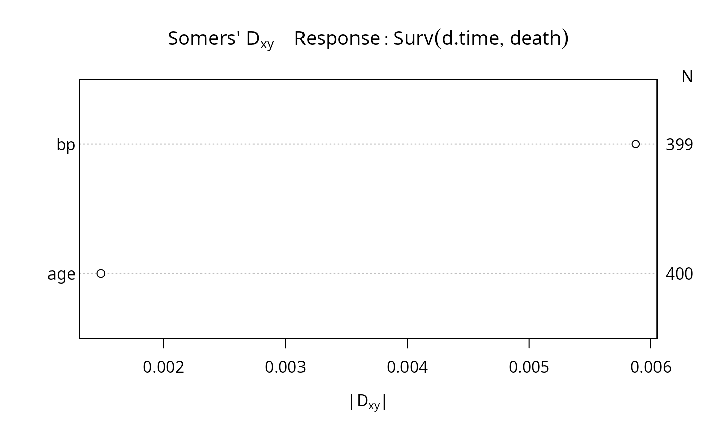 #> Somers' Rank Correlation for Censored Data Response variable:Surv(d.time, death)
