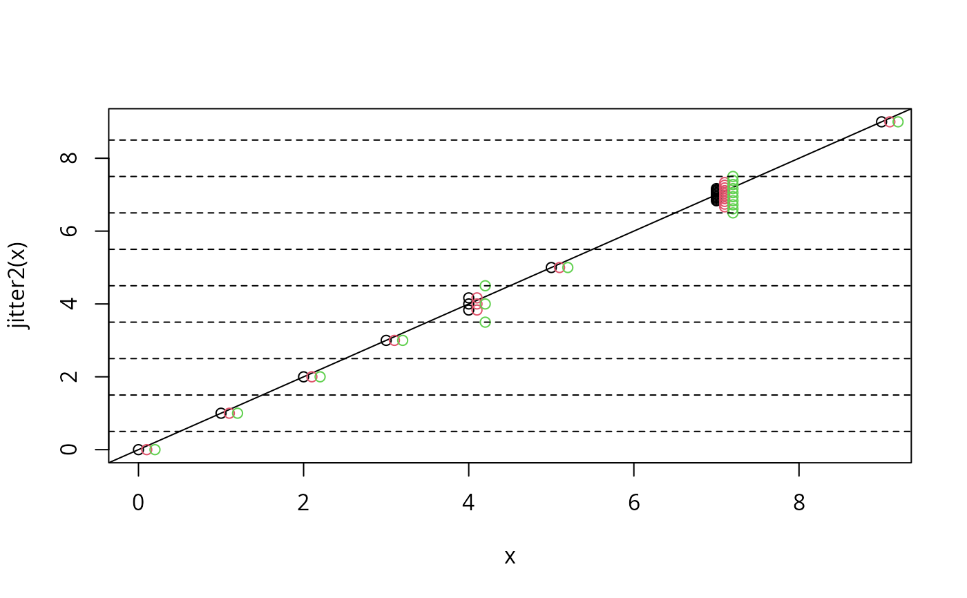 points(x+0.2, jitter2(x, fill=1), col=3); abline(h=seq(0.5,9,1), lty=2)