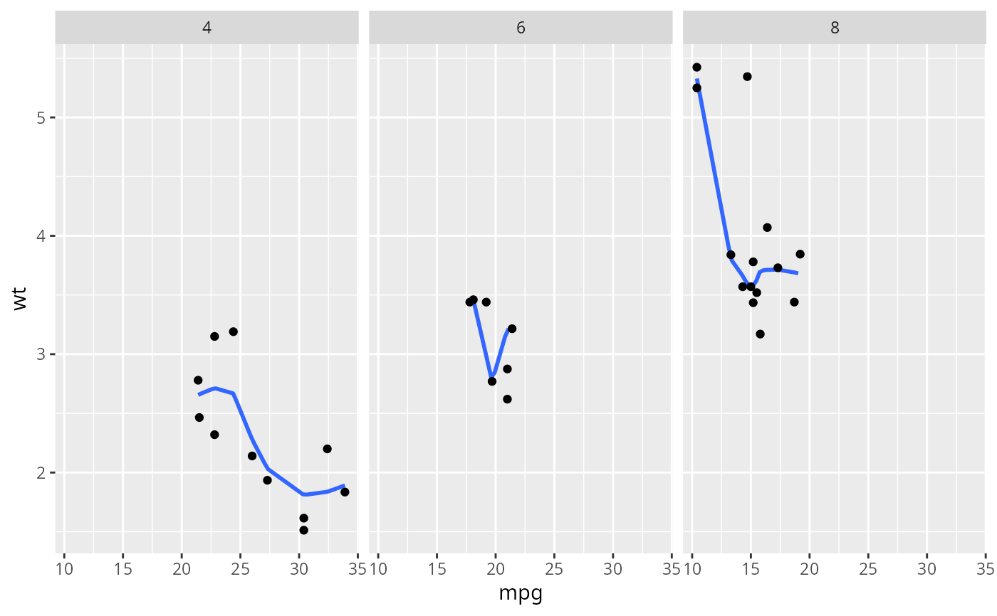 c <- ggplot(mtcars, aes(y=wt, x=mpg)) + facet_grid(. ~ cyl)