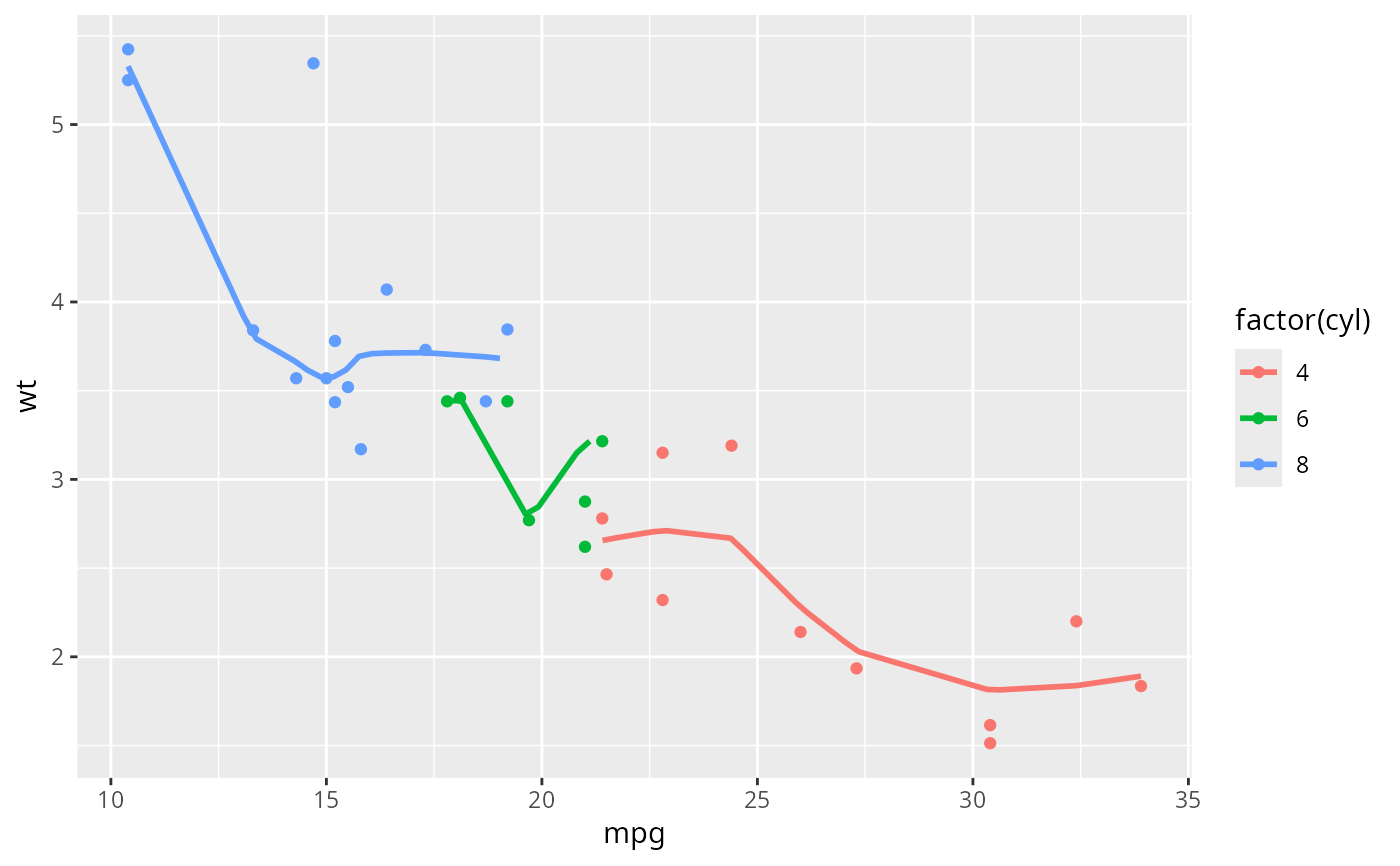 c + stat_plsmo(aes(fill = factor(cyl))) + geom_point()