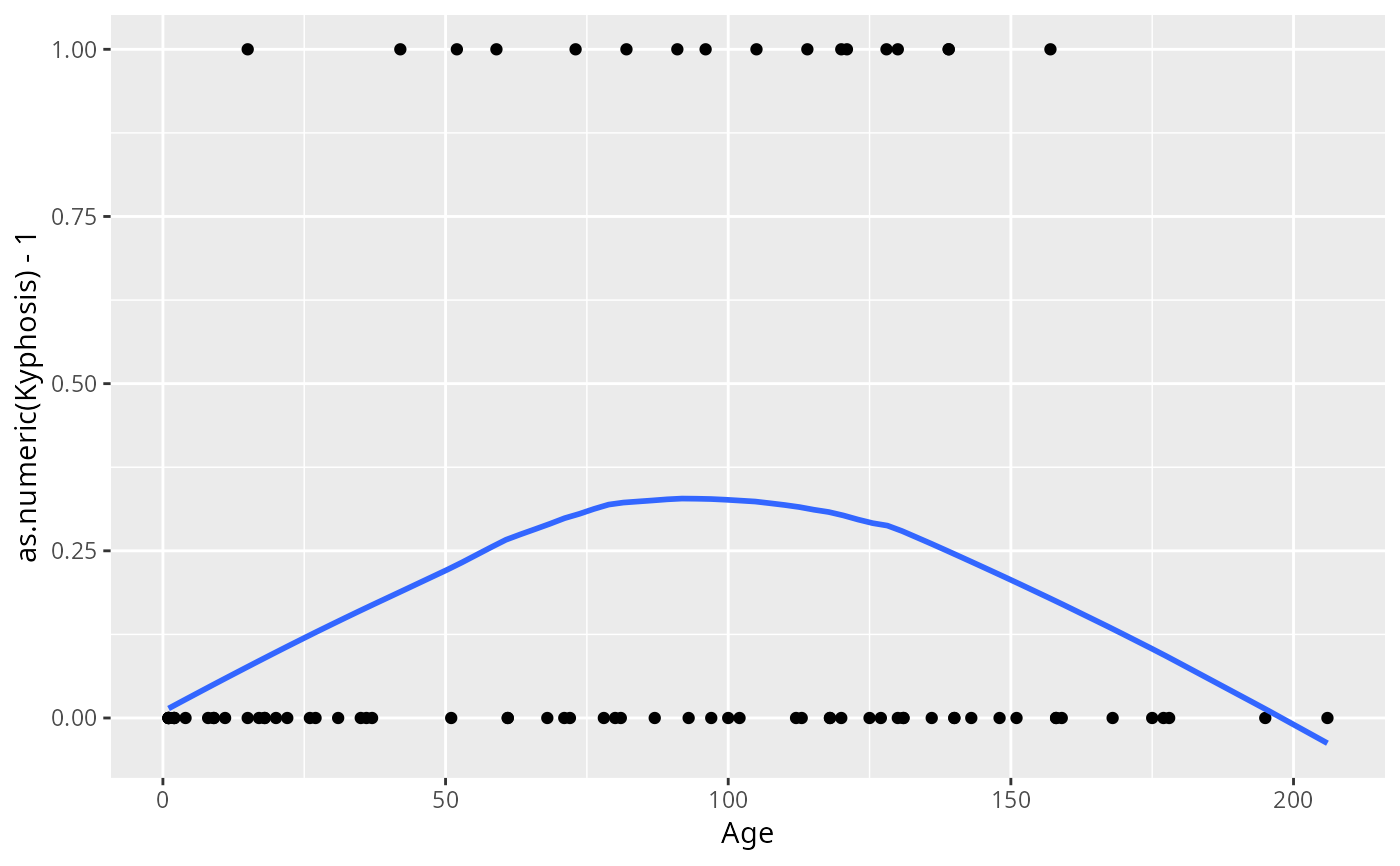 qplot(Age, as.numeric(Kyphosis) - 1, data = kyphosis) + stat_plsmo()