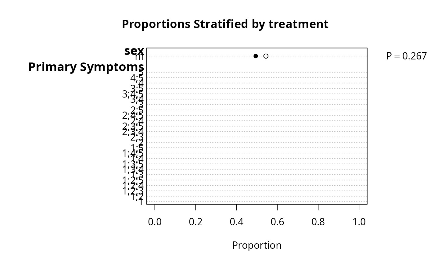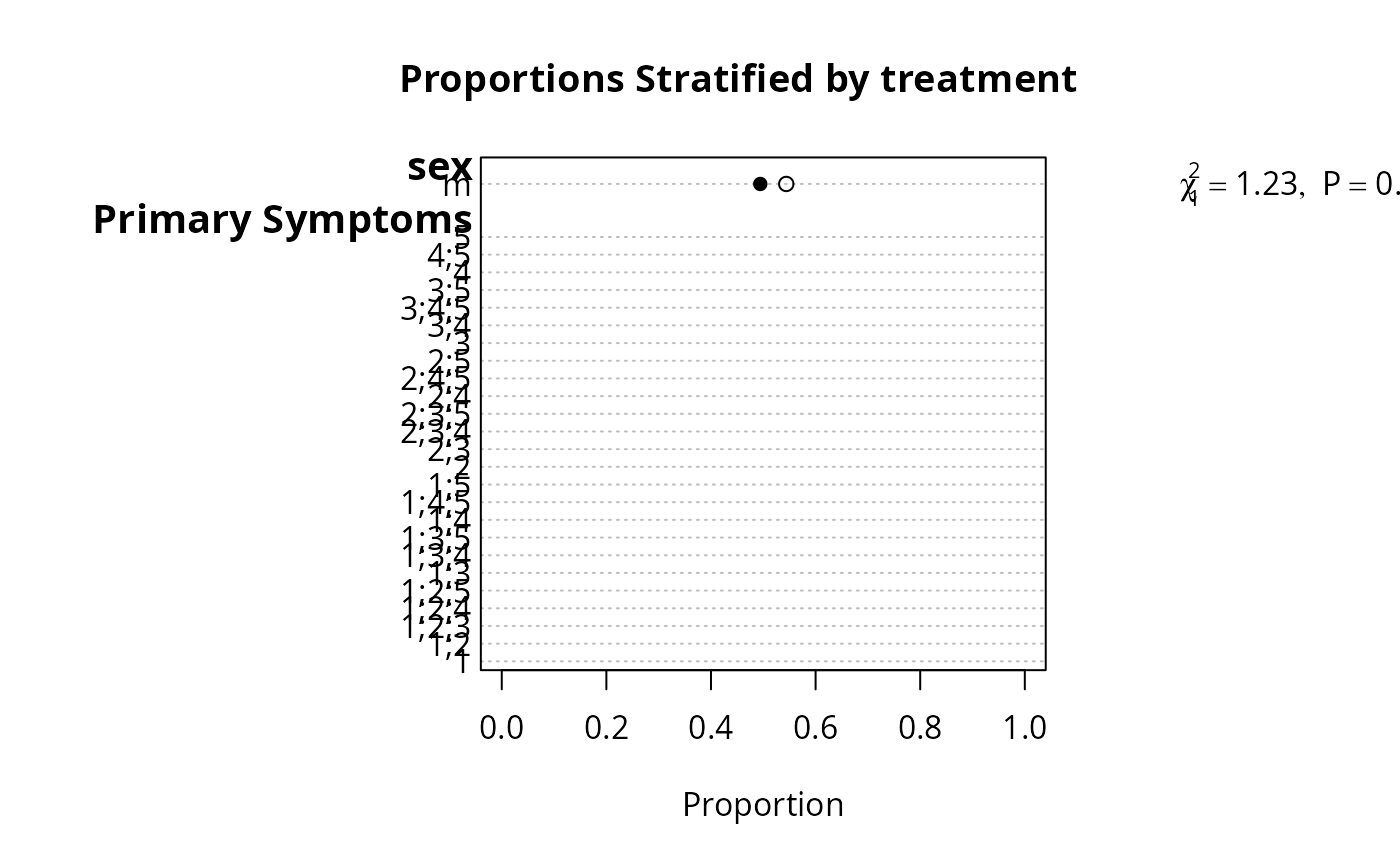 f <- summaryM(age + sex + sbp + Symptoms ~ treatment, test=TRUE)