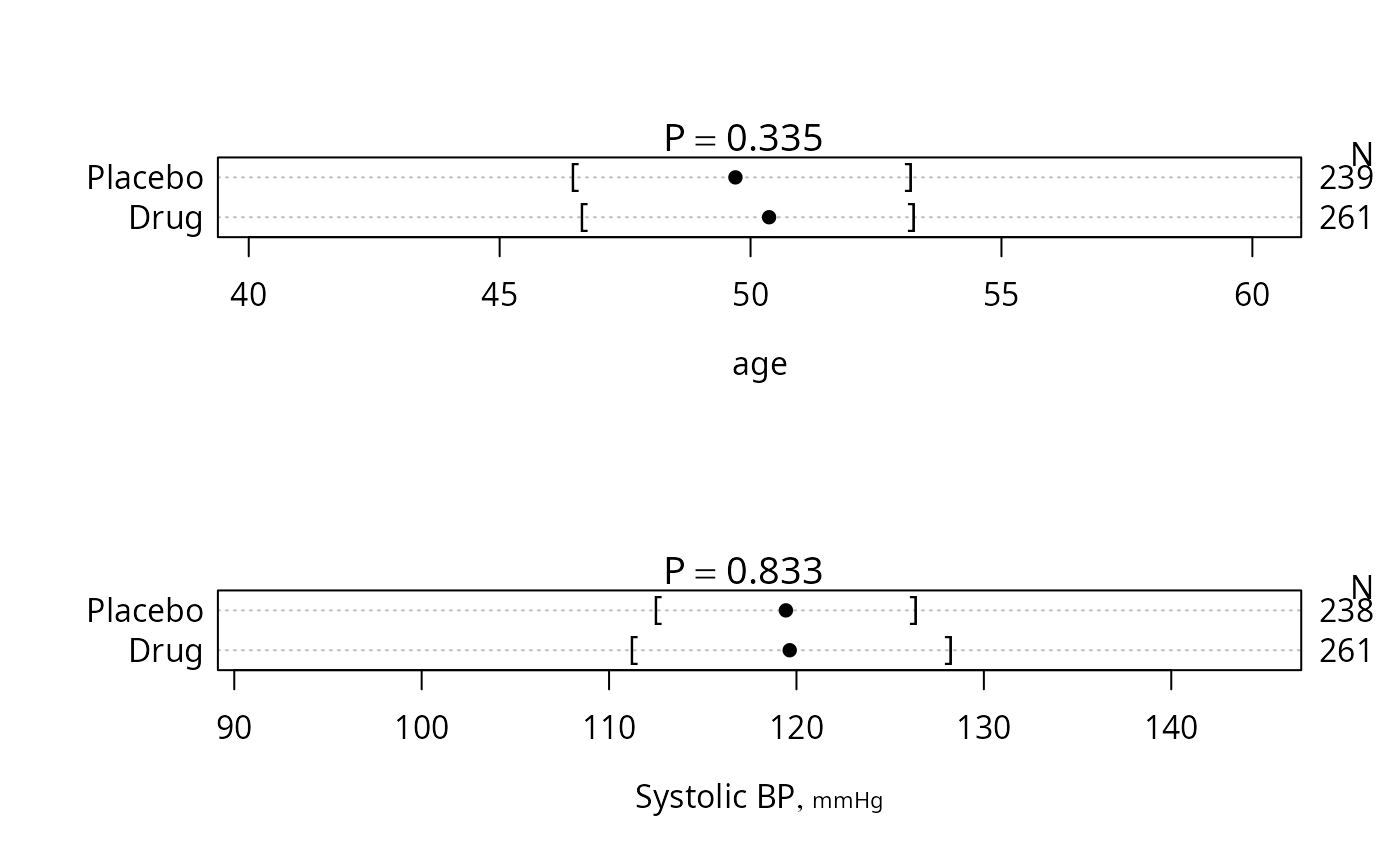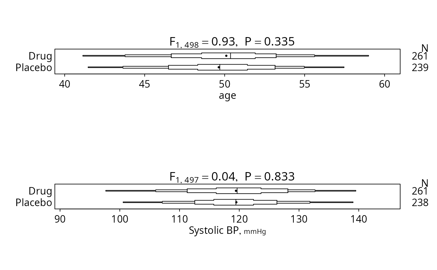 #> |Systolic BP [mmHg] |247| 111/120/128 | 113/120/127 | F=0.03 d.f.=1,245 P=0.862 |