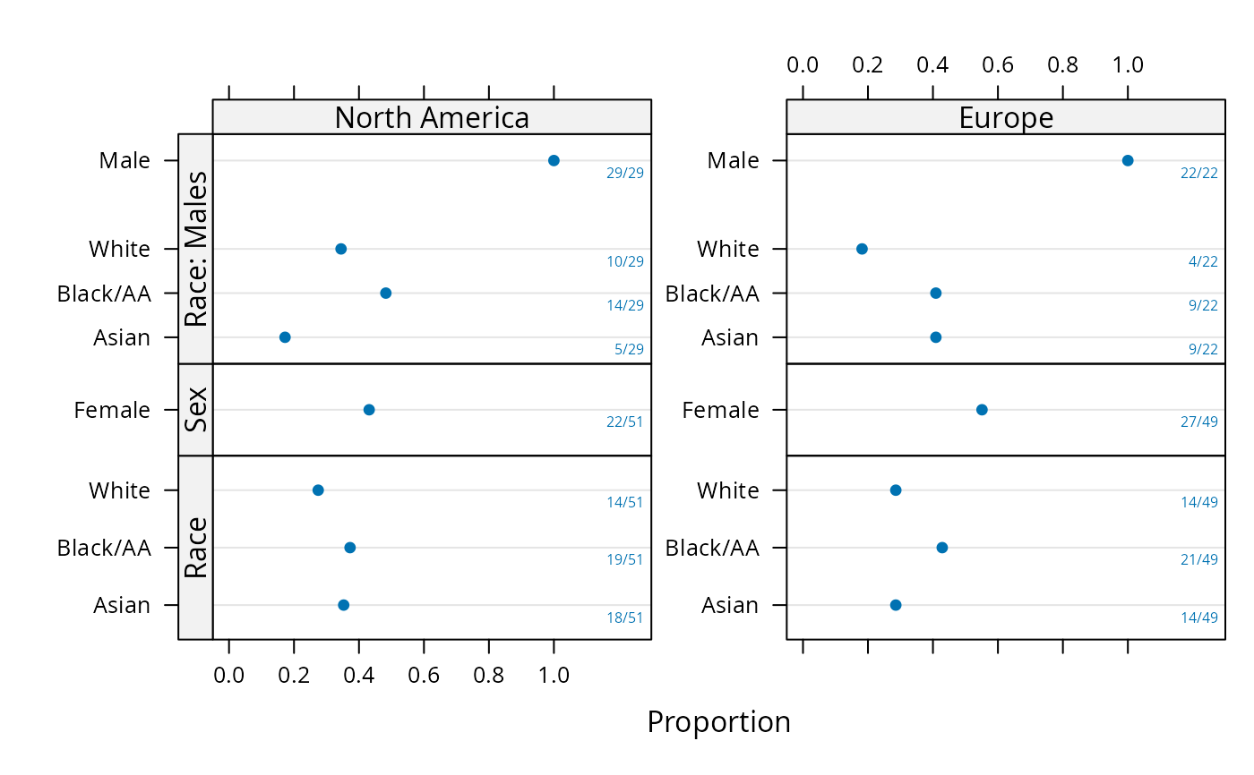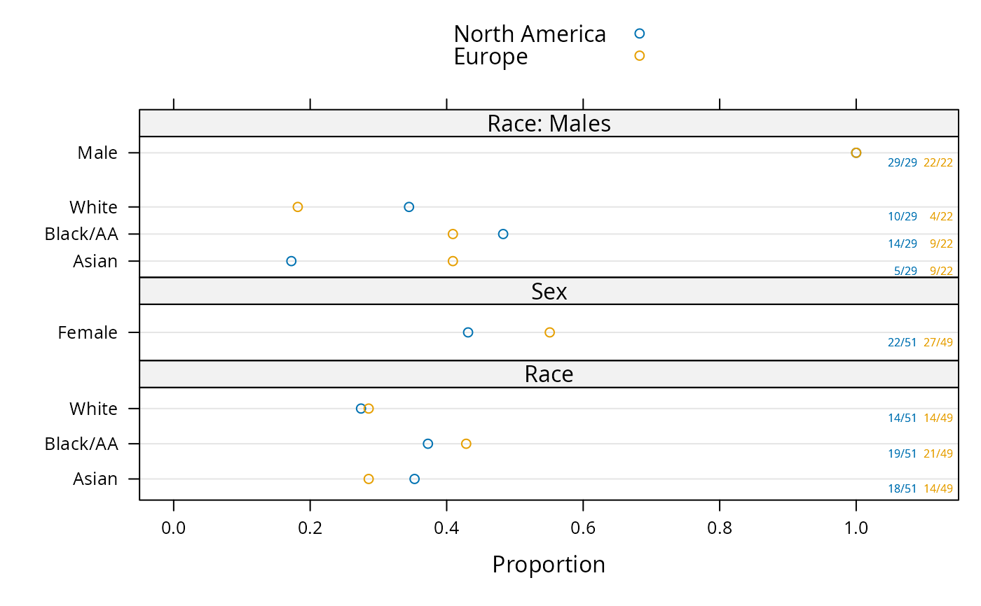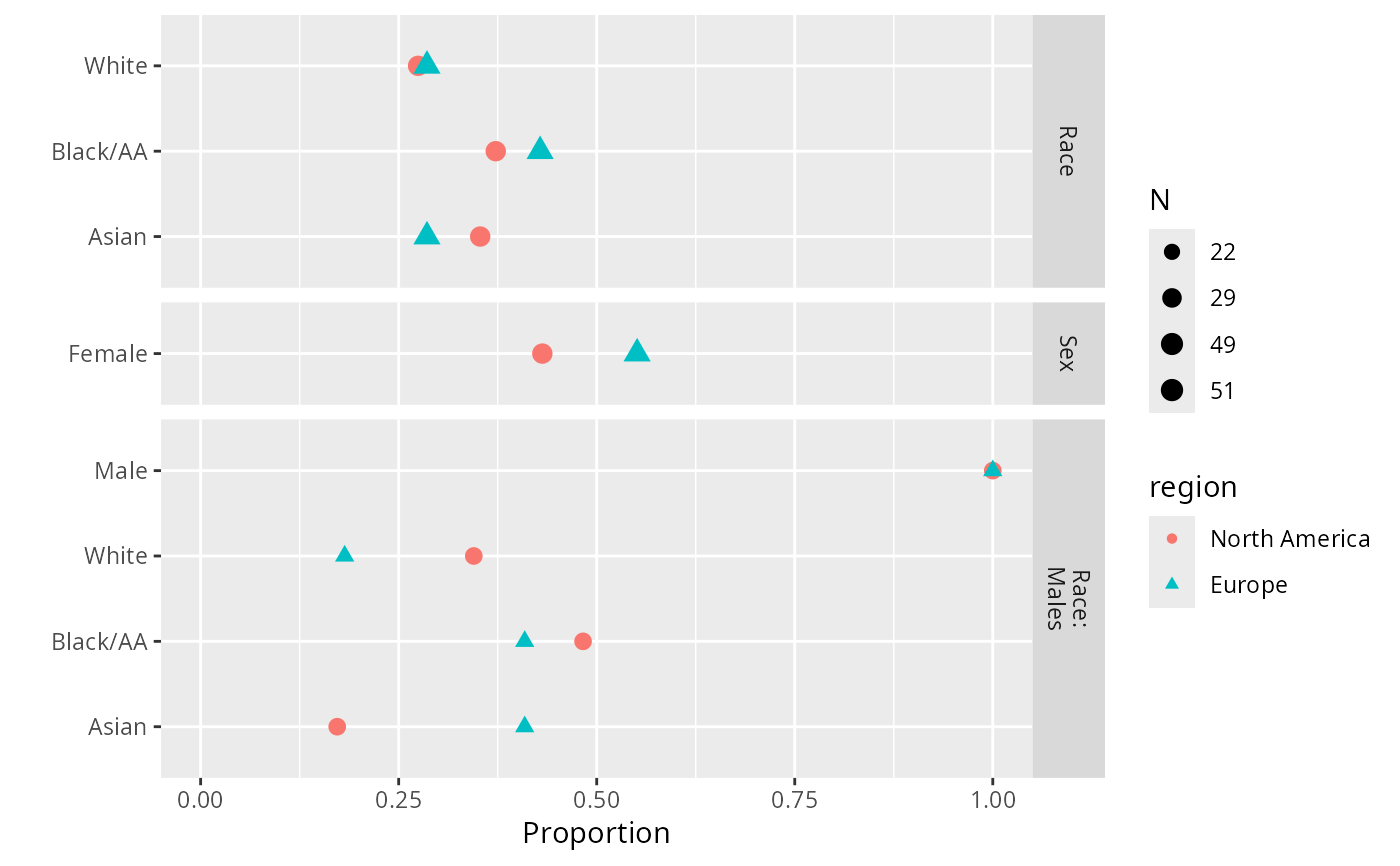 plot(summaryP(race + sex ~ region, data=d), exclude1=FALSE, col='green')