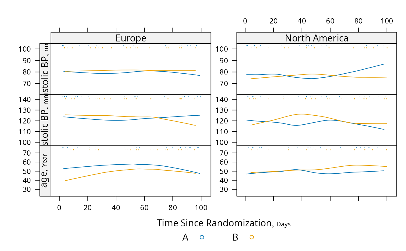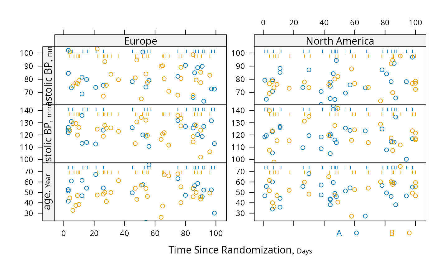 s <- summaryS(age + sbp + dbp ~ days + region + treat, data=d)