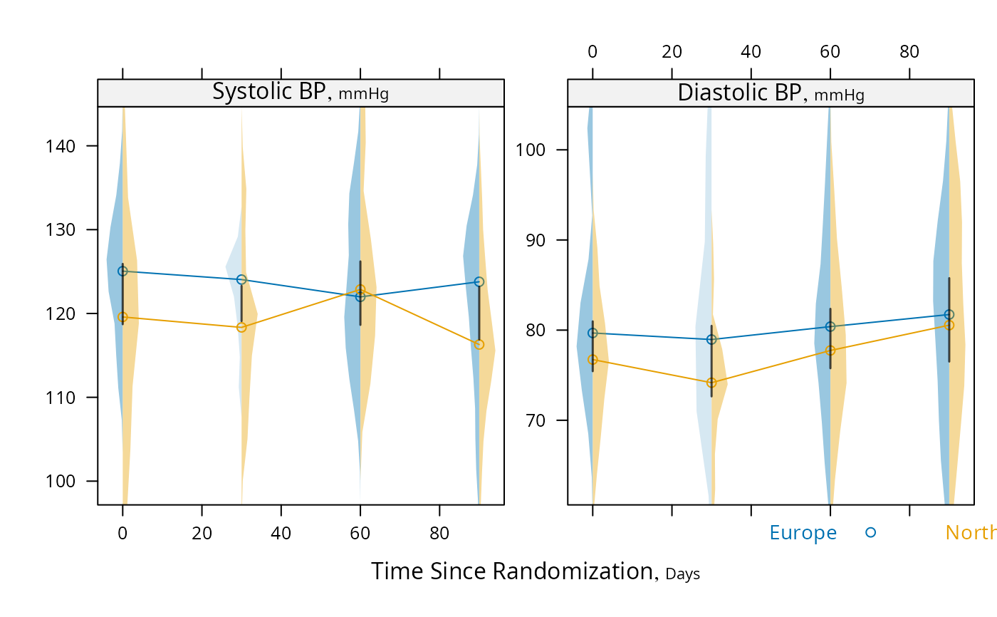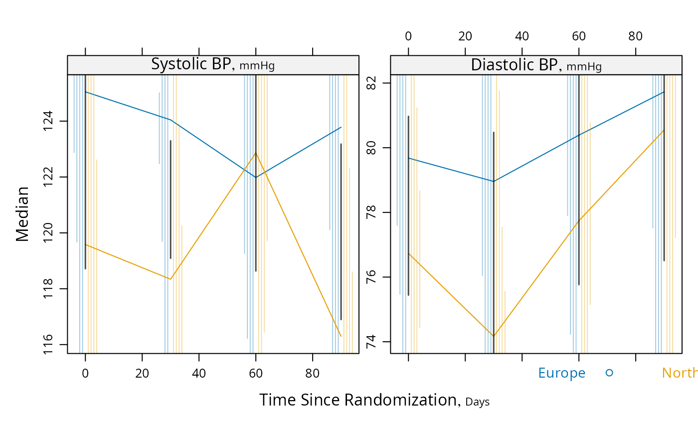 s <- summaryS(sbp + dbp ~ days + region, data=d)