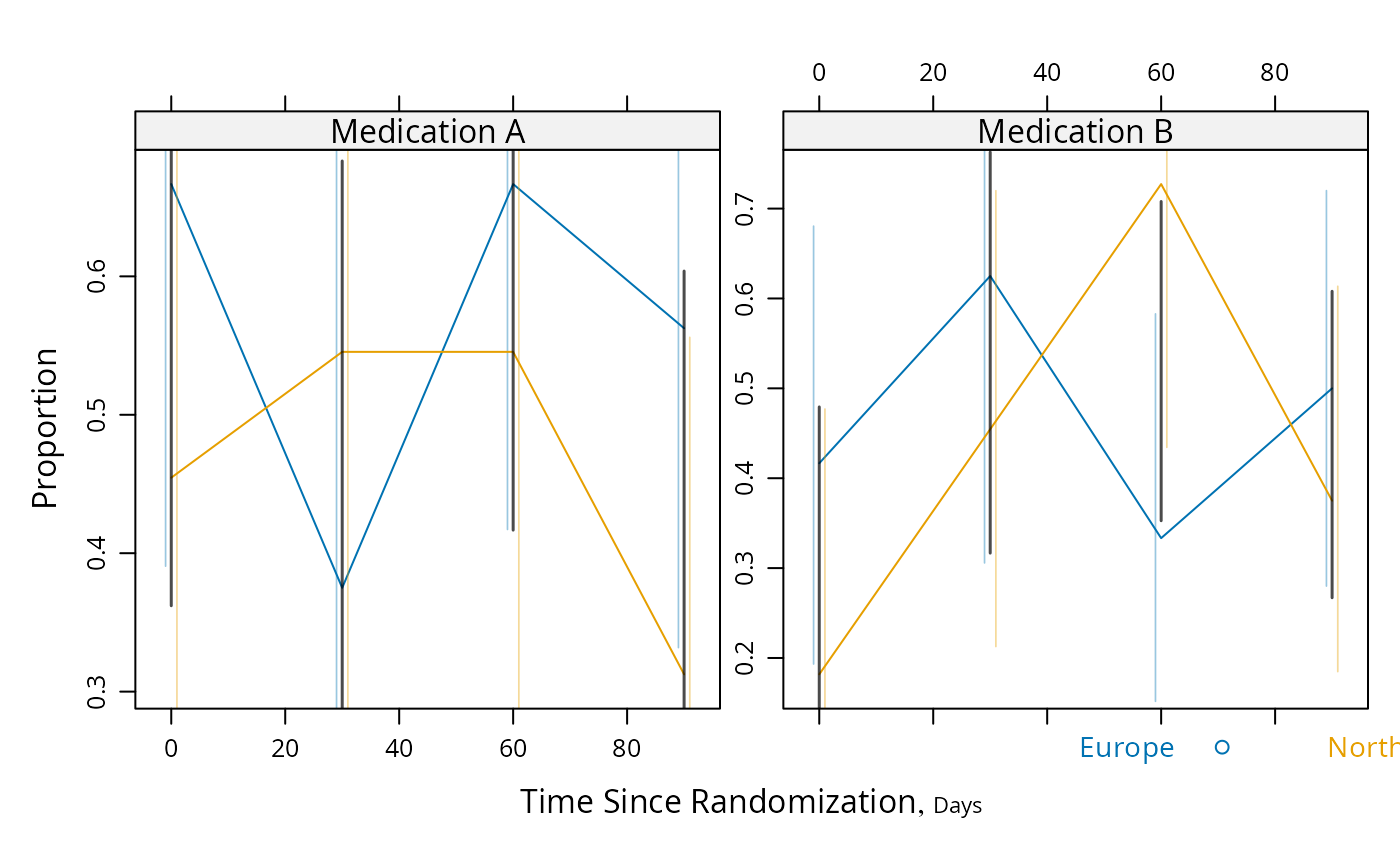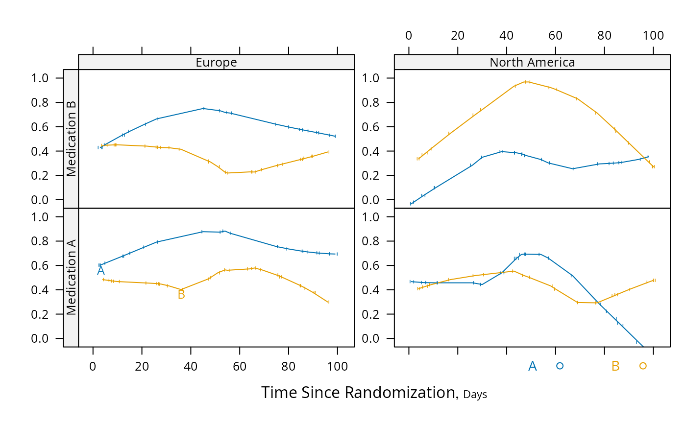 s <- summaryS(meda + medb ~ days + treat + region, data=d)