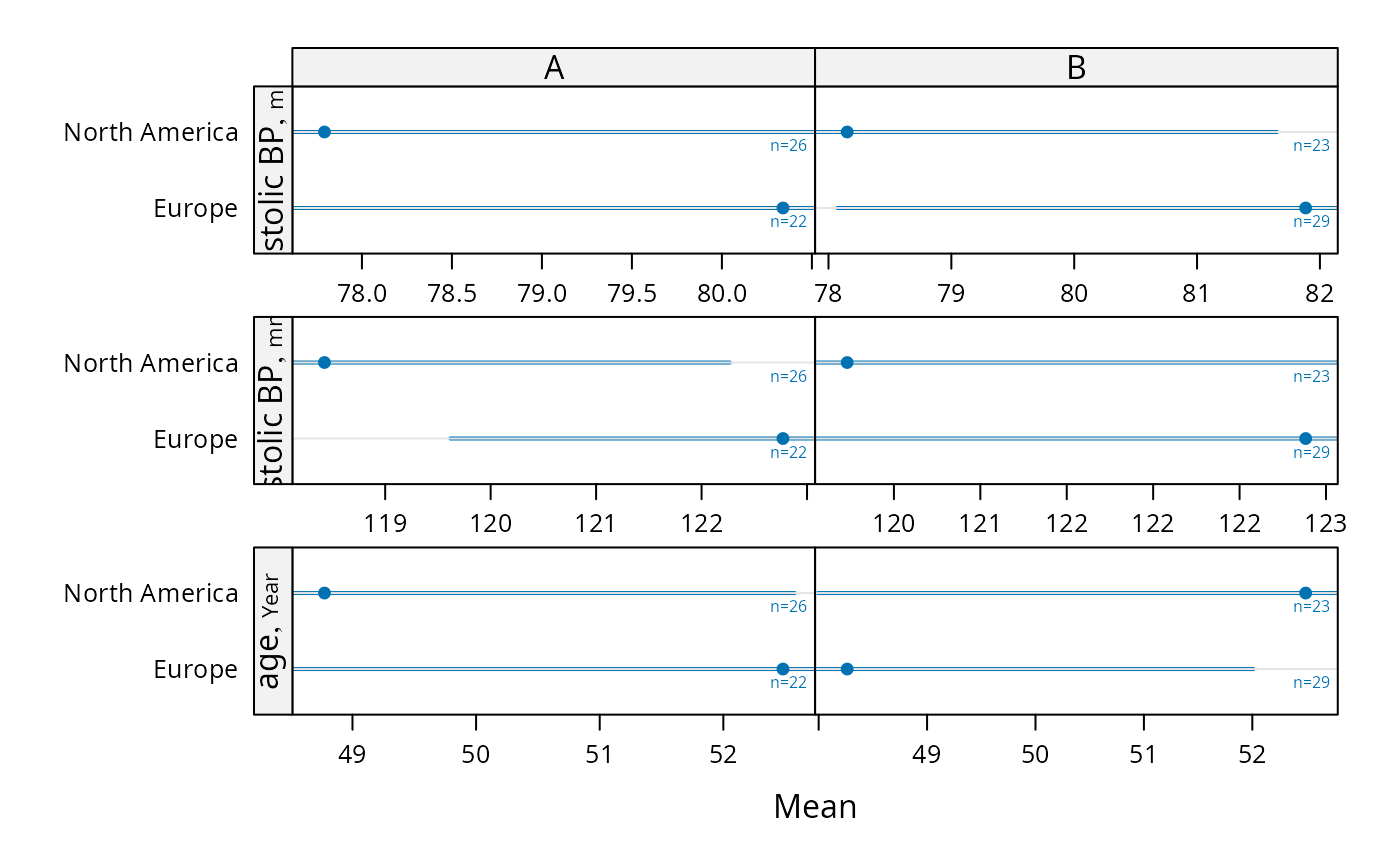 s <- summaryS(age + sbp + dbp ~ region + treat, data=d, fun=f)