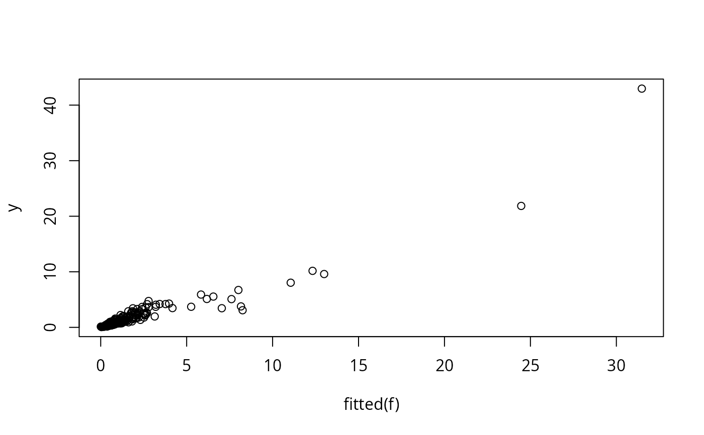 plot(fitted(f), y) # or: plot(predict(f,statistic='fitted'), y)