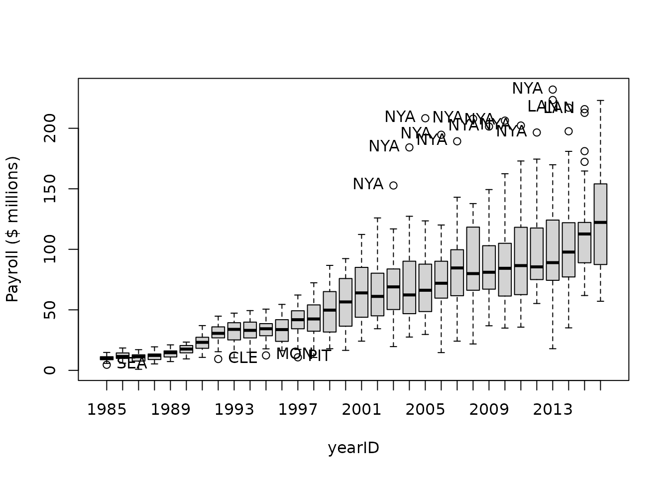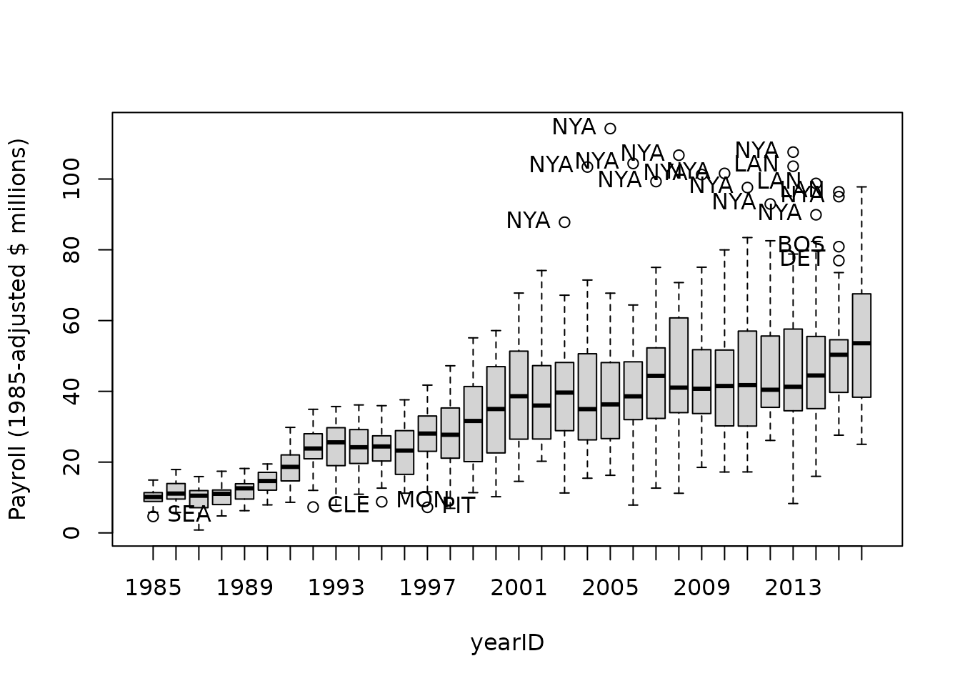 out <- car::Boxplot(payroll ~ yearID, data=payroll,