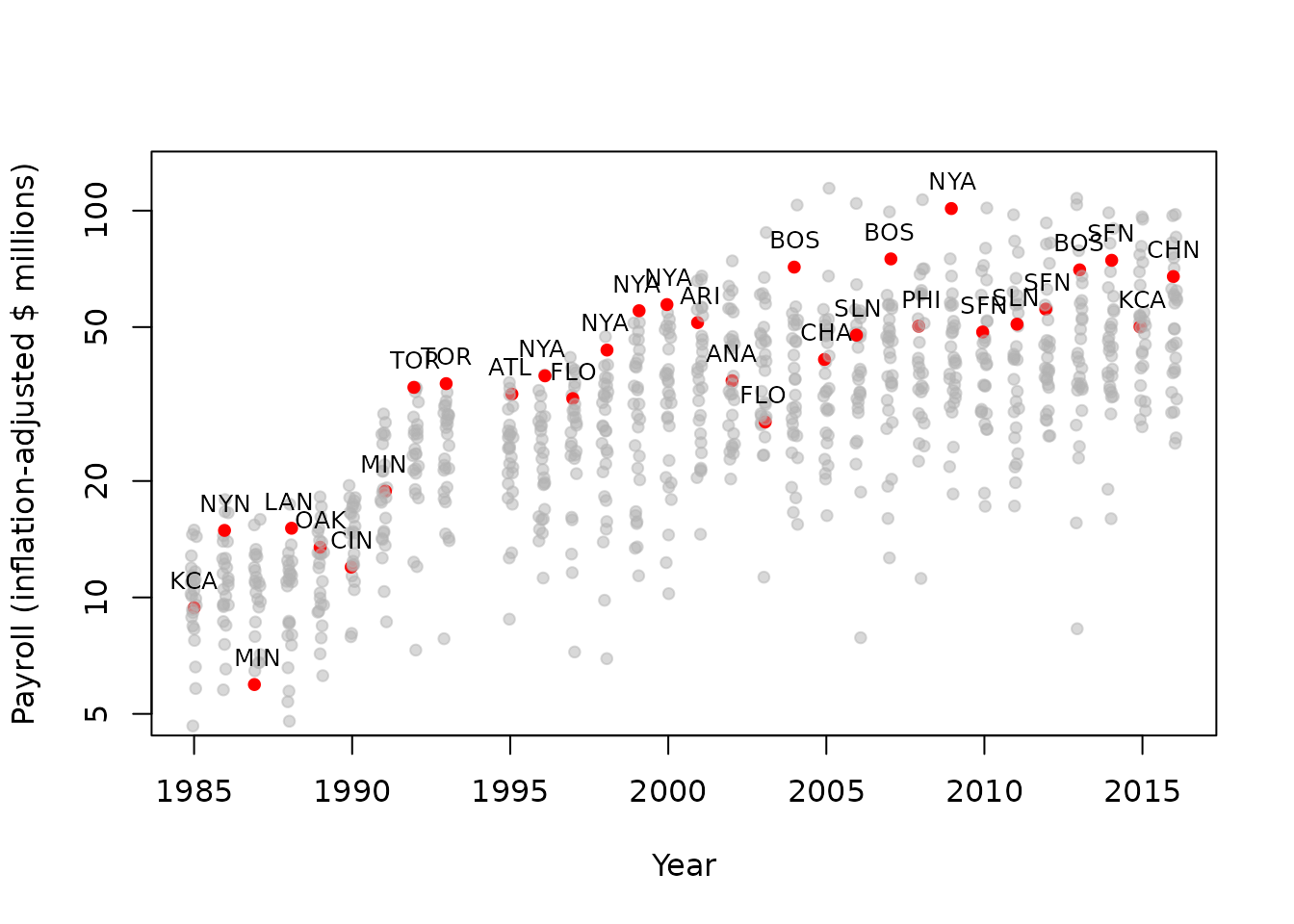 This plot shows inflation-adjusted payroll on a log scale to avoid the dominating influence of the most recent years. We jitter the points to avoid overplotting, and use a transparent gray color for the non-winners, red for the winner in each year.