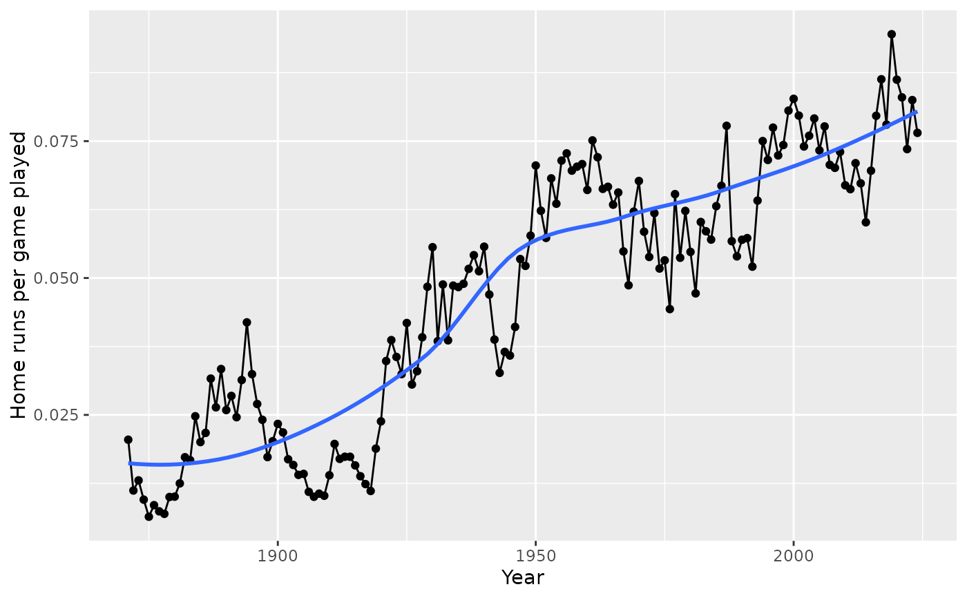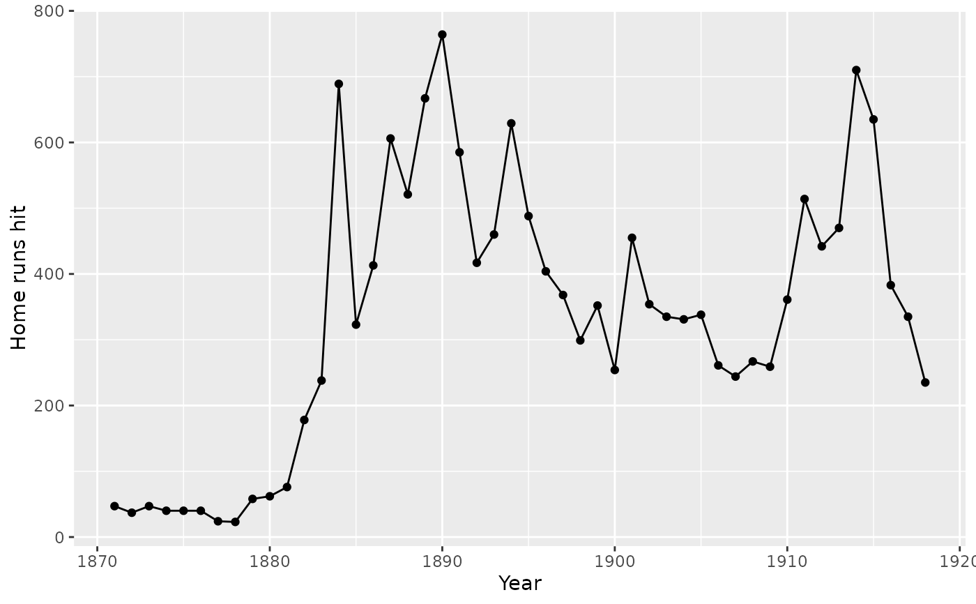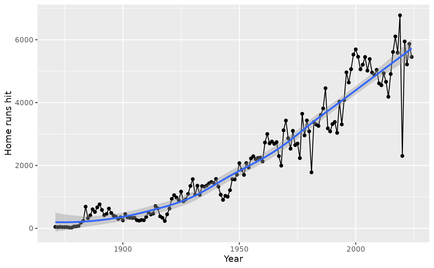 labs(x = "Year", y = "Home runs hit")