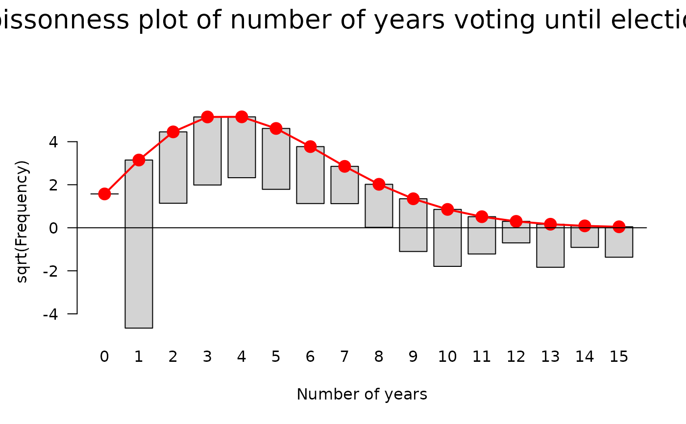 main="Poissonness plot of number of years voting until election")