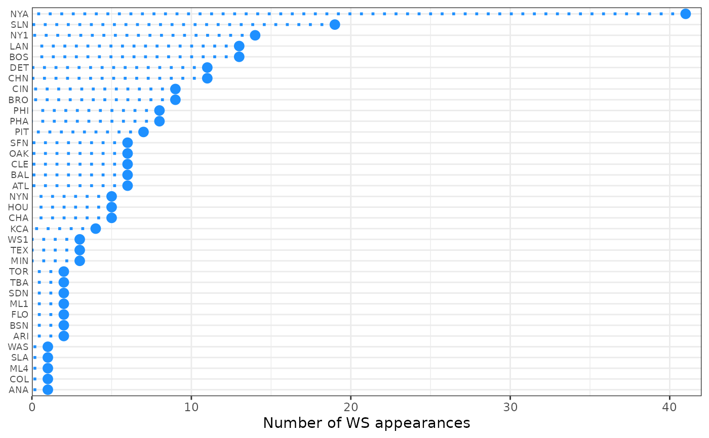 filter(yearID >= 1903) %>% # modern WS started in 1903