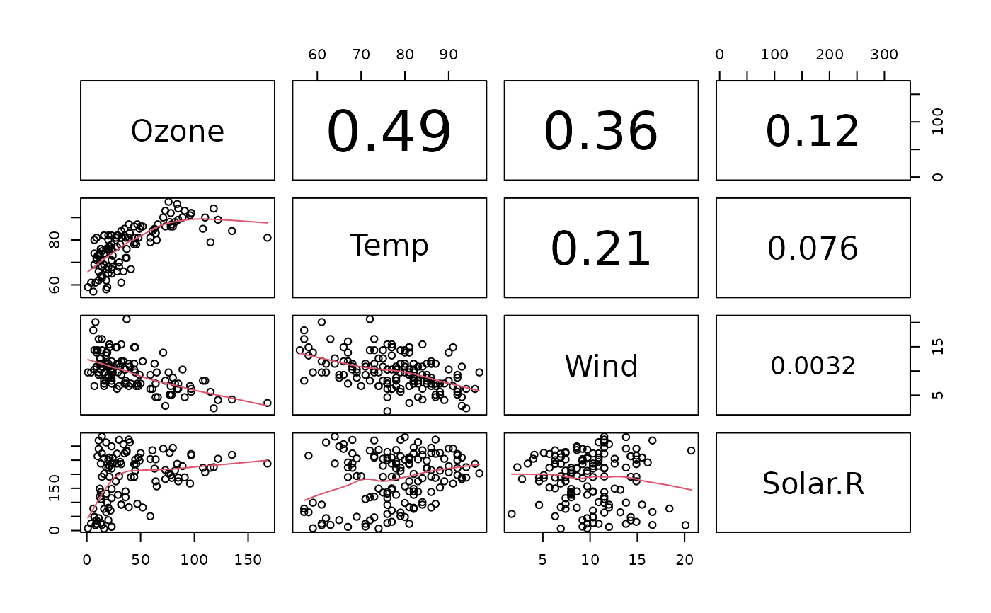 pairs(~ Ozone + Temp + Wind + Solar.R, data=airquality,