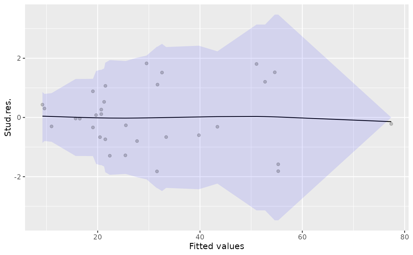 The dashed line shows the smoothed mean of the standardized residuals and should generally follow the horizontal line through (0,0).