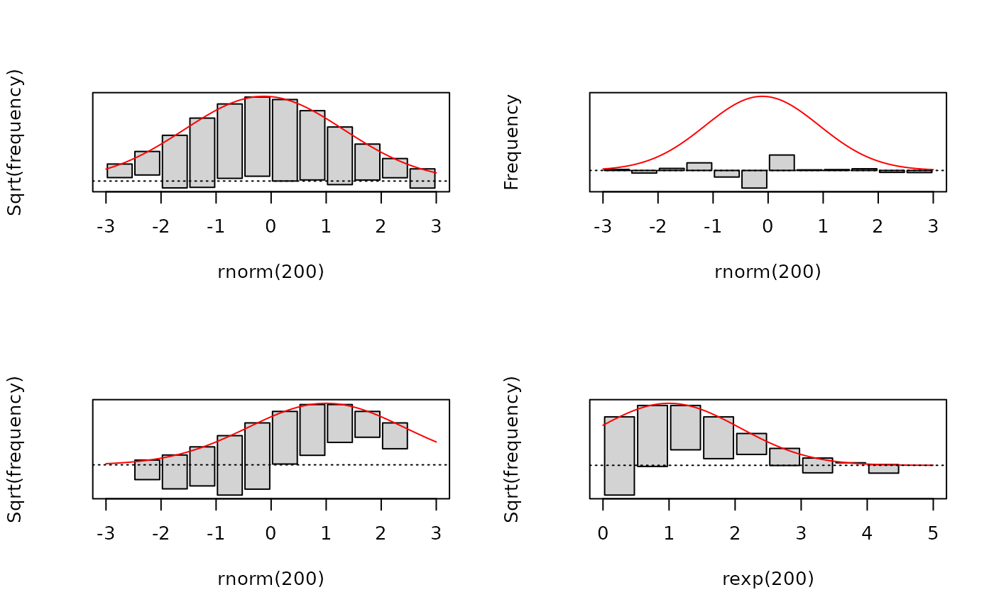 Create a hanging rootogram for a quantitative numeric vector and compare it to a Gaussian distribution.