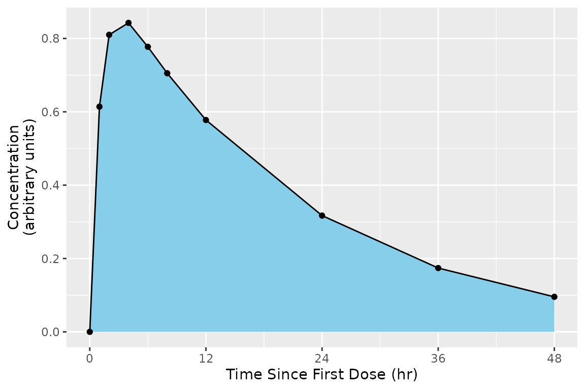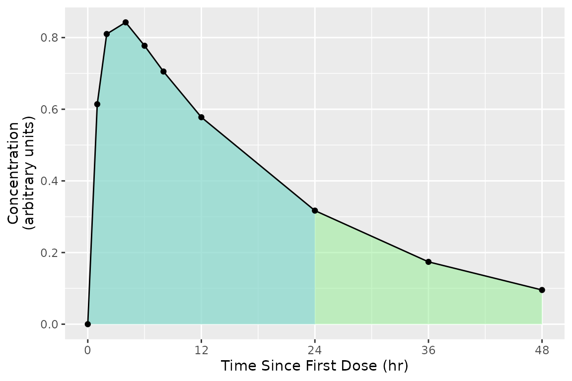 As a concrete example, consider the figure below shows the concentration-time profile of a study subject in a multiple-dose study. The group is all points in the figure, and the interval for the last day (144 to 168 hr) is the area with blue shading.
