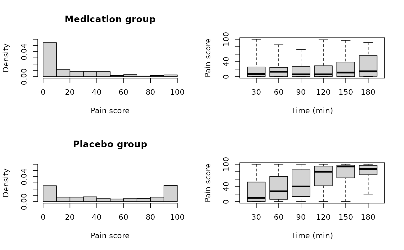 hist(new$y[new$treatment == 1], xlab = "Pain score", main = "Medication group",