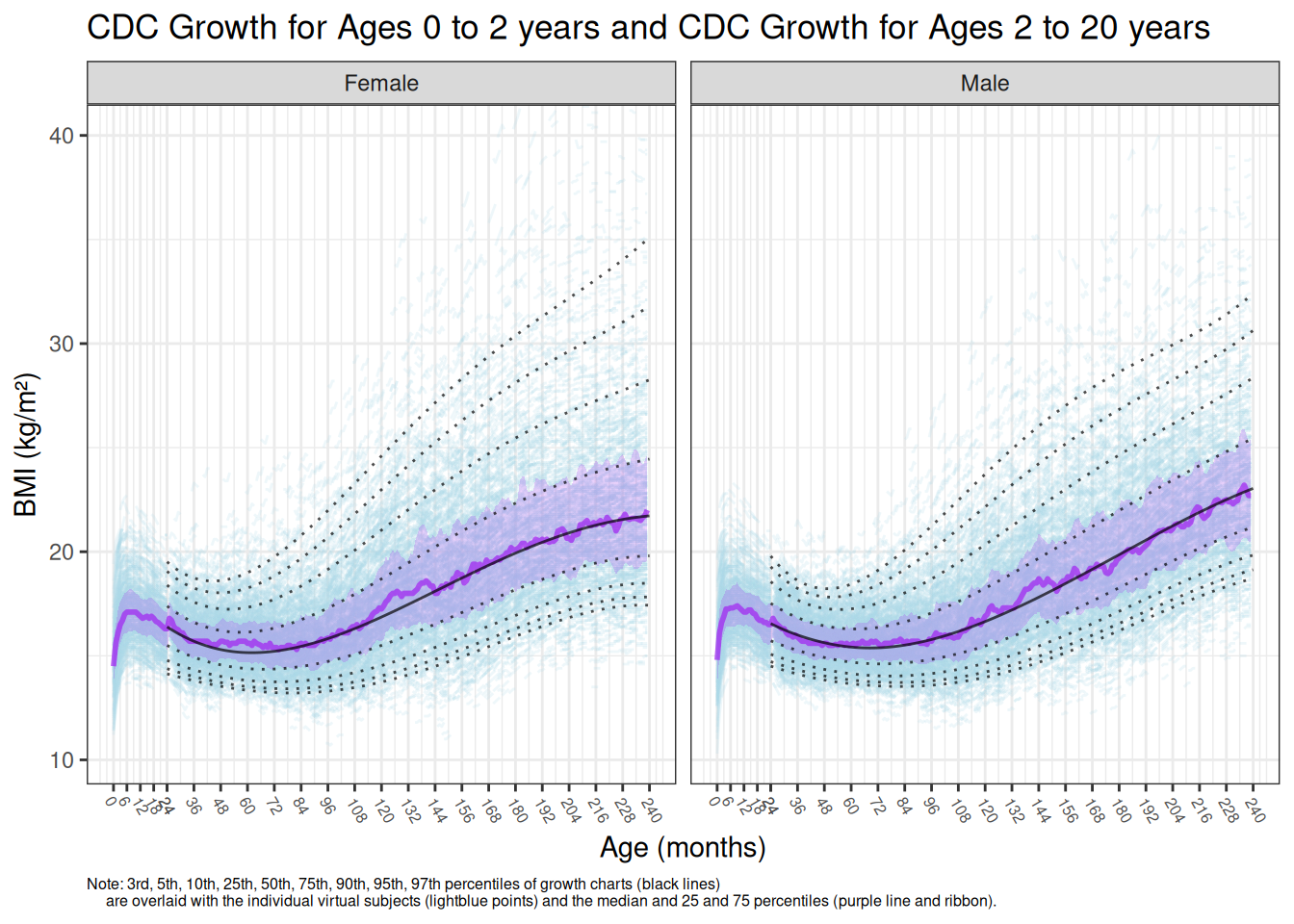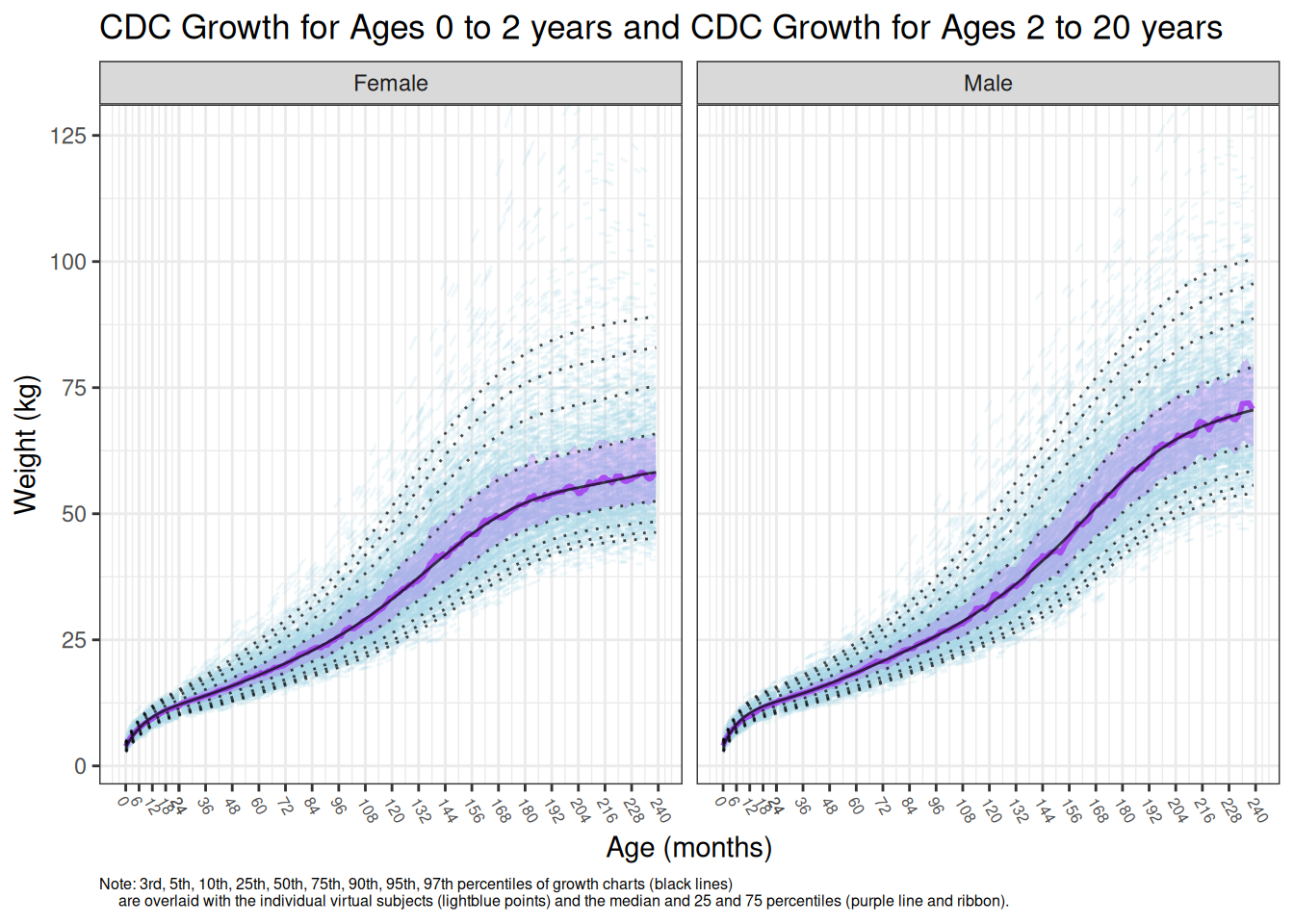 demo <- grow_kid(data = demo0, grow_time = 3, tstep = 1)Finally, visually validate that the virtual population is reflective of the CDC growth chart data.