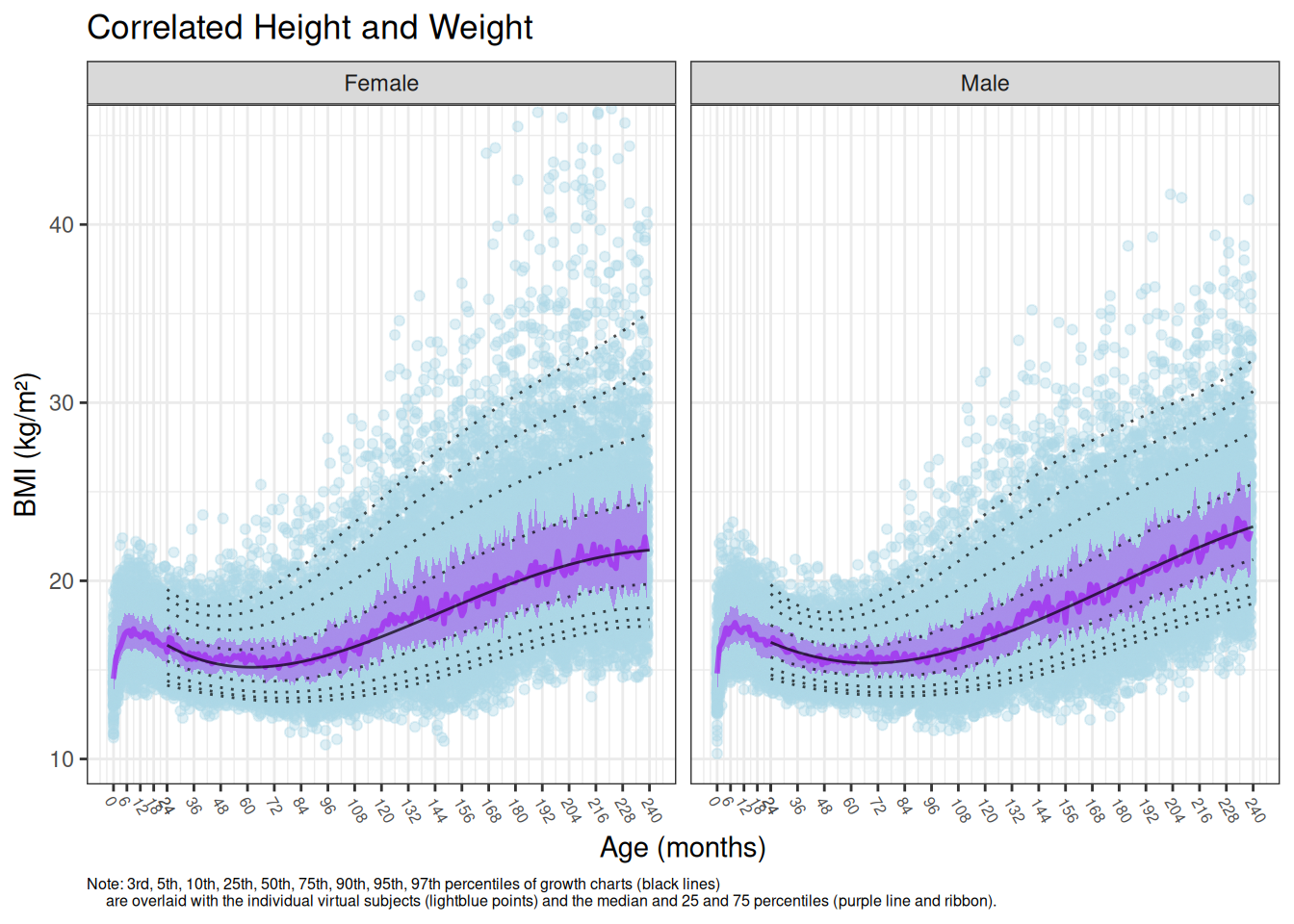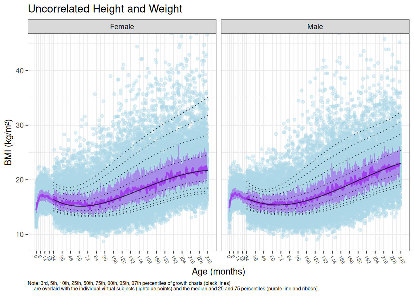 The below simulations demonstrate the impact of including versus excluding the height and weight correlations. Note the discrepancy in simulated versus reported BMI percentiles for ages >2 years when simulating without height and weight correlations. Without the height and weight correlations, there is a discontinuity at 24 months when the simulation methodology changes away from using CDC weight-for-stature charts and the lower ribbon of the simulated data extends to the 10th reported percentile rather than the 25th.