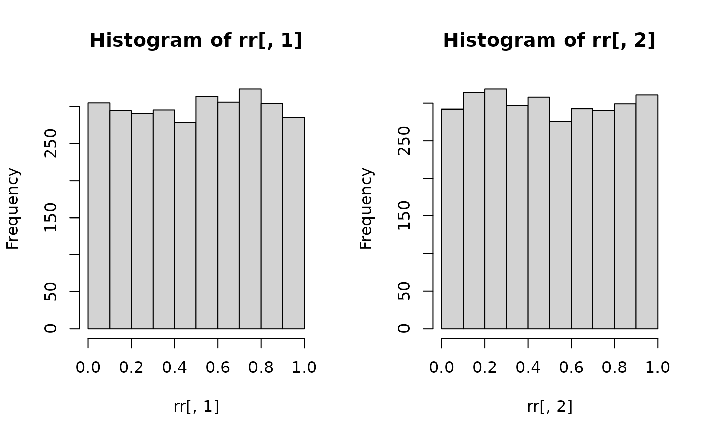 hist(rr[, 1]); hist(rr[, 2]) # Should be uniform
