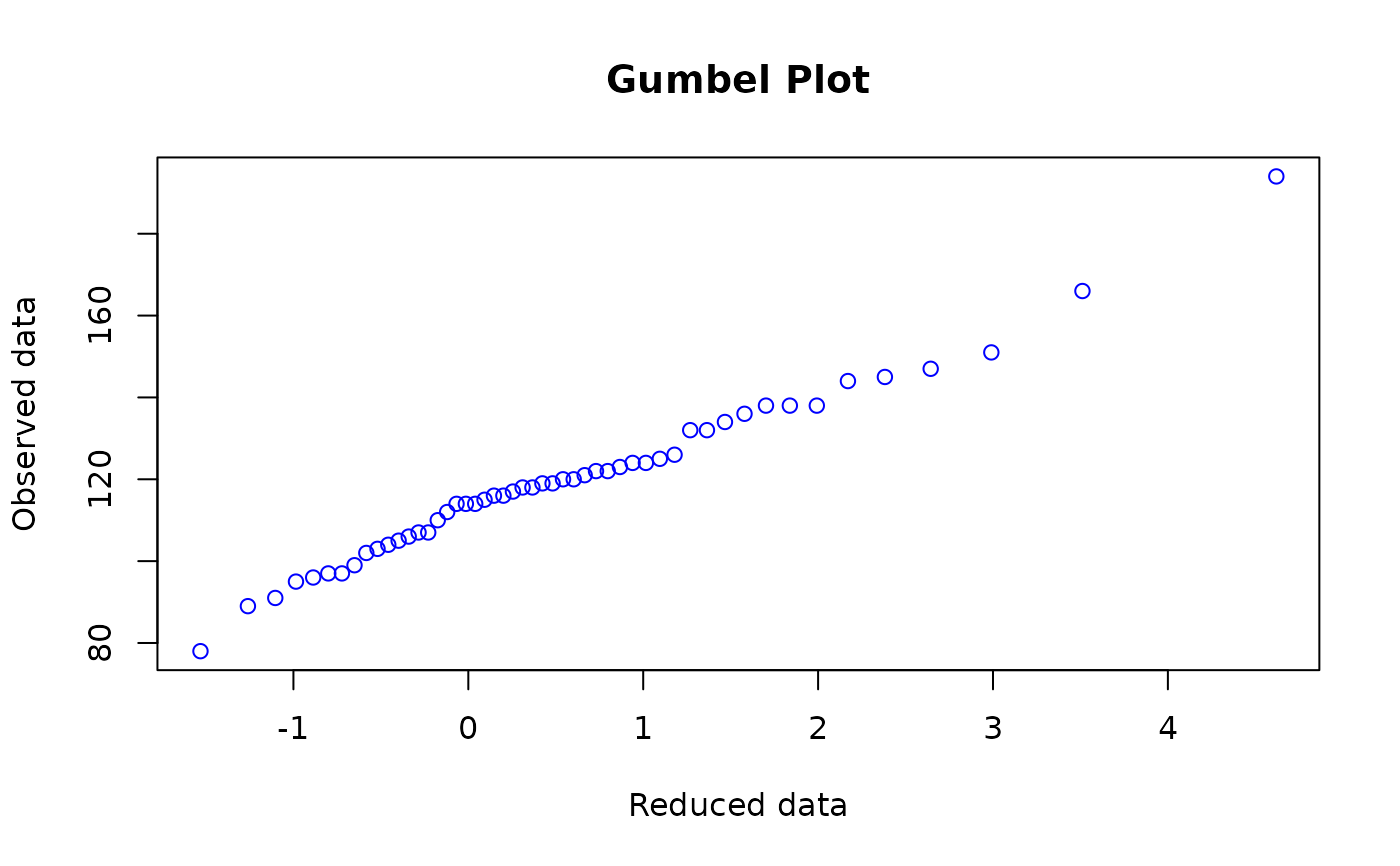If \(Y\) has a Gumbel distribution then plotting the sorted values \(y_i\) versus the reduced values \(r_i\) should appear linear. The reduced values are given by $$r_i = -\log(-\log(p_i)) $$ where \(p_i\) is the \(i\)th plotting position, taken here to be \((i-0.5)/n\). Here, \(n\) is the number of observations. Curvature upwards/downwards may indicate a Frechet/Weibull distribution, respectively. Outliers may also be detected using this plot.